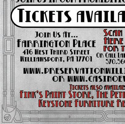 and The Rowley House Museum. With the purchase of a ticket, you’ll get to enjoy an open bar with liquor, wine and beer, oyster bar, catered hors d’oeuvres, popcorn bar, raffle prizes and more! And come ready to win! There will be gaming tables including blackjack, hold ‘em, and roulette. You won’t want to miss a fun event benefiting a good cause. Get your ticket today! You can get your tickets at www. preservationwilliamsport.com/shop.