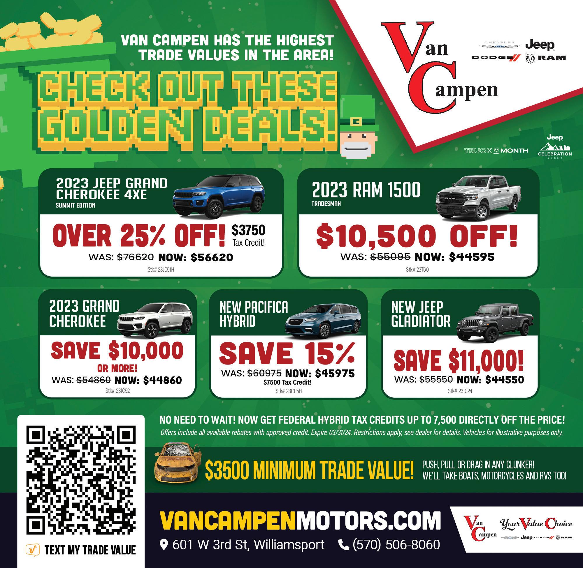7 • Webb Weekly March 27, 2024 www.webbweekly.com Call 570-326-9322 Offers expire 3/31/24. See dealer for complete details. Dealer not responsible for typographical errors. Pictures may not represent actual units. 2024 Impact Advertising • 24FFDM-UFC-WWK032724 5071 LYCOMING MALL DR. • MONTOURSVILLE • (570) 368-8121 • FIND US ON: WWW.FAIRFIELDFORD.COM OF MONTOURSVILLE ALL in-stock pre-owned vehicles have been MARKED DOWN AN ADDITIONAL $1,000! SEE ERIC HAMILTON OR CHRIS CALDWELL FOR YOUR NEXT FANTASTIC DEAL! SAVE TODAY! PRE-OWNED! 2020 FORD EDGE ST AWD Stk #: M23948 33,048 Mi. $ 29,500 NOW ONLY: CHECK IT OUT! PRE-OWNED! 2020 VOLKSWAGEN TIGUAN SE 2.0T Stk #: M23955 23,760 Mi. $ 24,500 NOW ONLY: SAVE TODAY! PRE-OWNED! 2020 FORD EXPLORER ST 4WD Stk #: M23949 39,703 Mi. $ 36,500 NOW ONLY: LOW MILES! PRE-OWNED! 2023 VOLKSWAGEN TAOS SE 4MOTION Stk #: M3273A Only 11 Mi. $ 29,500 NOW ONLY: LOW MILES! PRE-OWNED! 2022 VOLKSWAGEN TAOS SE Stk#: M23936 14,008 Mi. $ 24,800 NOW ONLY: GREAT DEAL! PRE-OWNED! 2020 FORD F-150 XLT SUPERCREW Stk #: M3205A 55,250 Mi. $ 41,800 NOW ONLY: SAVE TODAY! PRE-OWNED! 2020 FORD EXPLORER XLT Stk #: M23937 28,912 Mi. $ 29,800 NOW ONLY: GREAT DEAL! PRE-OWNED! 2021 VOLKSWAGEN TIGUAN SEL 2.0T Stk#: M23933 43,592 Mi. $ 24,800 NOW ONLY: LOW MILES! PRE-OWNED! 2021 JEEP WRANGLER UNLIMITED SAHARA ALTITUDE 4X4 Stk #: M23890A 17,842 Mi. $ 41,800 NOW ONLY: CHECK IT OUT! PRE-OWNED! 2020 FORD ESCAPE SE AWD Stk #: M23966 30,545 Mi. $ 21,500 NOW ONLY: LOW MILES! PRE-OWNED! 2021 FORD F-150 KING RANCH Stk #: M3280A 55,648 Mi. $ 49,500 NOW ONLY: GREAT DEAL! PRE-OWNED! 2020 FORD EDGE SEL AWD Stk #: M23964 40,027 Mi. $ 23,500 NOW ONLY: SAVE TODAY! PRE-OWNED! 2020 FORD EXPLORER XLT 4WD Stk #: M23946 32,105 Mi. $ 29,800 NOW ONLY: CHECK IT OUT! PRE-OWNED! 2020 FORD EXPLORER PLATINUM Stk #: M23925 44,636 Mi. $ 34,800 NOW ONLY: 0% APR FOR 72 MOS 1.9% APR FOR 84 MOS on select new Ford Mustang Mach-E OR