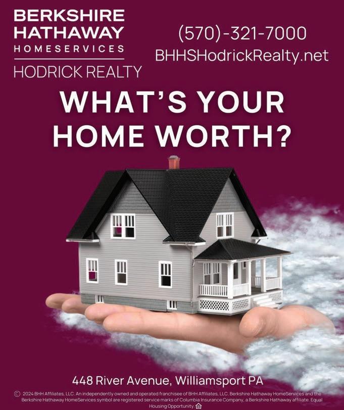 NO PEEKING ALLOWED! SEE PAGE 62 FOR THIS WEEKS GAMES • Swimming Pools • Drinking Water 570-322-1829 www.fulmerswater.com • Credit Cards Accepted • Dependable Delivery • DEP Licensed Serving the Williamsport Area and the Surrounding Communities for 43 years TREE SERVICE AJ’s • Large Tree Removal • Stump Grinding • Bucket Trucks • Chipper • Skid Steers & Much More 24 Hour Emergency Work Jim Esposito Jr. Proprietor • 570-321-1970 Fully Insured • Free Estimates Free Estimates ROB CONBOY - Owner Licensed & Insured Montoursville, PA 570-772-8880 RESIDENTIAL AND COMMERCIAL EXTERIOR CLEANING ROOFS - SIDING - DECKS - SIDEWALKS GUTTERS - BRICK - FENCES - DRIVEWAYS www.washbritepw.com Powerwashing JEAN SERVICES FOR ALL YOUR EXCAVATING NEEDS Call: Robbie (570) 447-7653 Todd (570) 447-5574 • Ditchwork • Grading • Building Pads • Land Clearing • Demolition • Reclaim Fields Install & Repair • Yards • Ponds • Septic Systems • Driveway WILLIAMSPORT AREA SCHOOL DISTRICT SEEKING: GENERAL MAINTENANCE The Williamsport Area School District is accepting applications for a full-time General Maintenance position. This position is responsible for the performance of general maintenance and upkeep of school buildings, equipment and grounds, with some minimal requirement for new construction. Starting salary $22.24/hour. Visit www.wasd.org/apply for application and job description. Deadline May 17, 2024 EOE