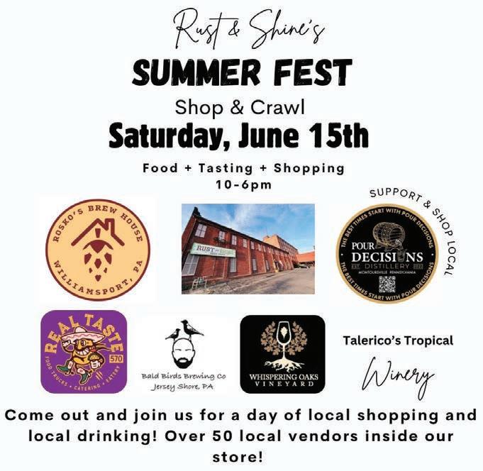 BOGO Deals! Page 26 Custom Steaks! Page 32 Mini-Golf Tourney! Page 31 VOLUME 22 • NUMBER 24 JUNE 12, 2024 A Family-Oriented Publication BOXES FOR DAD Bernadette Ulsamer Page 18 MY DAD Andrea McElroy Page 24 HAPPY FATHER’S DAY Steph Nordstrom Page 4 The Best Dads Let Their Children Fly. The Most Loved Children Will Soar. OF THE DAY Must present coupon at time of ordering. Coupon is non-transferable. Only valid at participating locations for dine-in only. Offer excludes alcoholic beverages. Not replaceable if lost or stolen. One-time use only. One coupon per table, per visit. Not valid in conjunction with other coupon, promotion or discount, (VALID MONDAY - FRIDAY • LUNCH 11am - 4pm) ~DISCOUNT APPLIES TO ITEM OF EQUAL OR LESSER VALUE~ 50 CENT WINGS $10 CHEESE FRIDAYS RIBS OF THE DAY DOUBLE-BASTED PORK RIBS | CHOICE OF SAUCE TM HALF RACK $14.39 FULL RACK $20.99 SUN MON TUE FRIDAY’S™ RIBS DOUBLE-BASTED PORK RIBS | CHOICE OF SAUCE $10 CHEESE BURGER KIDS EAT HALF RACK $14.39 FULL RACK $20.99 50 CENT WINGS $14.99 AMERICAN CHEESE, LETTUCE, TOMATO, RED ONIONS, PICKLES TRADITIONAL OR BONELESS 10 PC MINIUM PER ORDER CHRISTIANS HELPING HONDURAS RUPERT’S SPECIALTY MEATS 102 N. Montour St., Montoursville • 570-368-8321 Monday - Tuesday - 8-5:30 • Wednesday 8-3 Thursday - Friday 8-5:30 • Saturday - 8-3:00 • Closed Sunday Porterhouse • T-Bone • N.Y. Strip • Delmonico CUSTOM STEAK THE BEST GIFT IS A Fatherʼs Day is Sunday, June 16th
