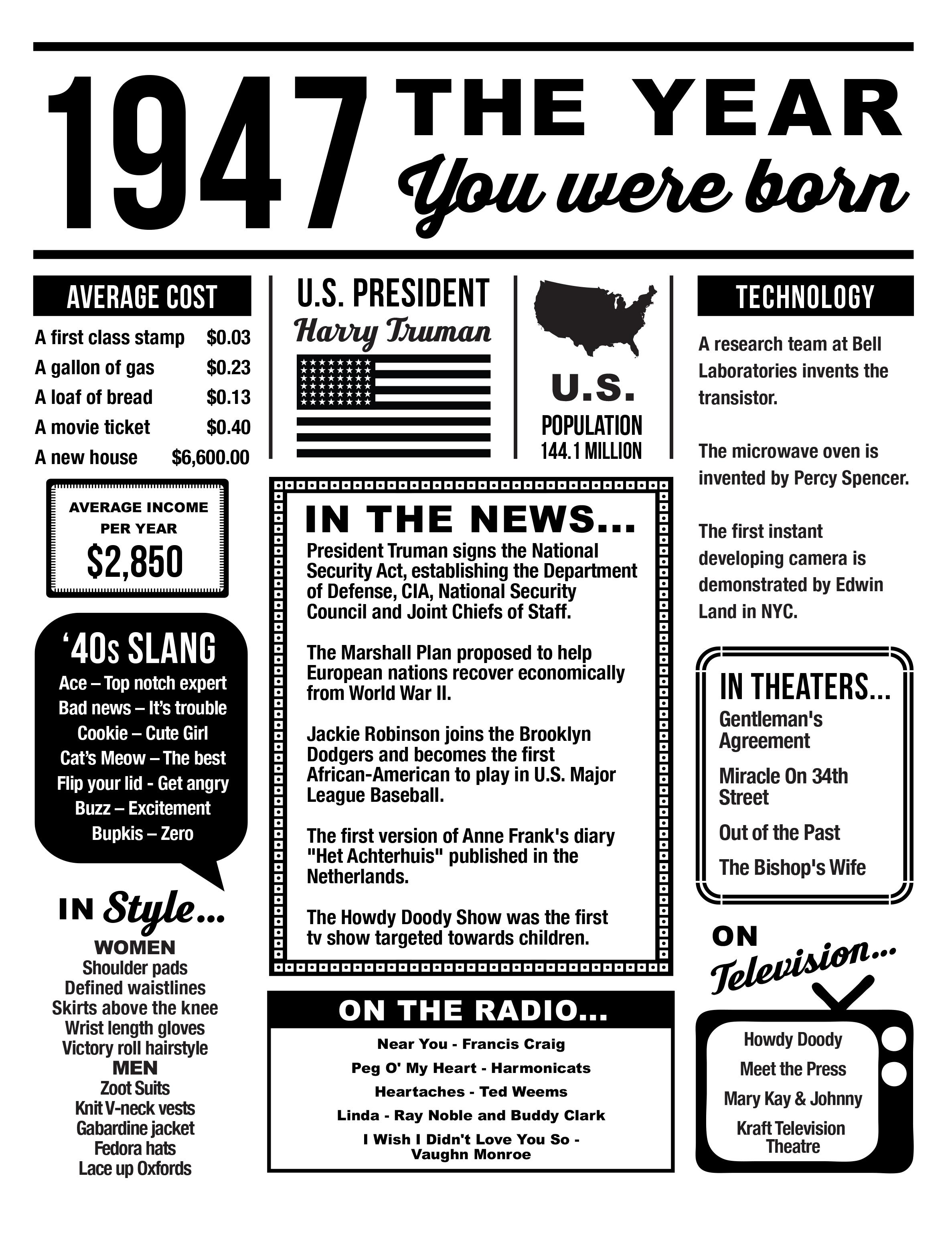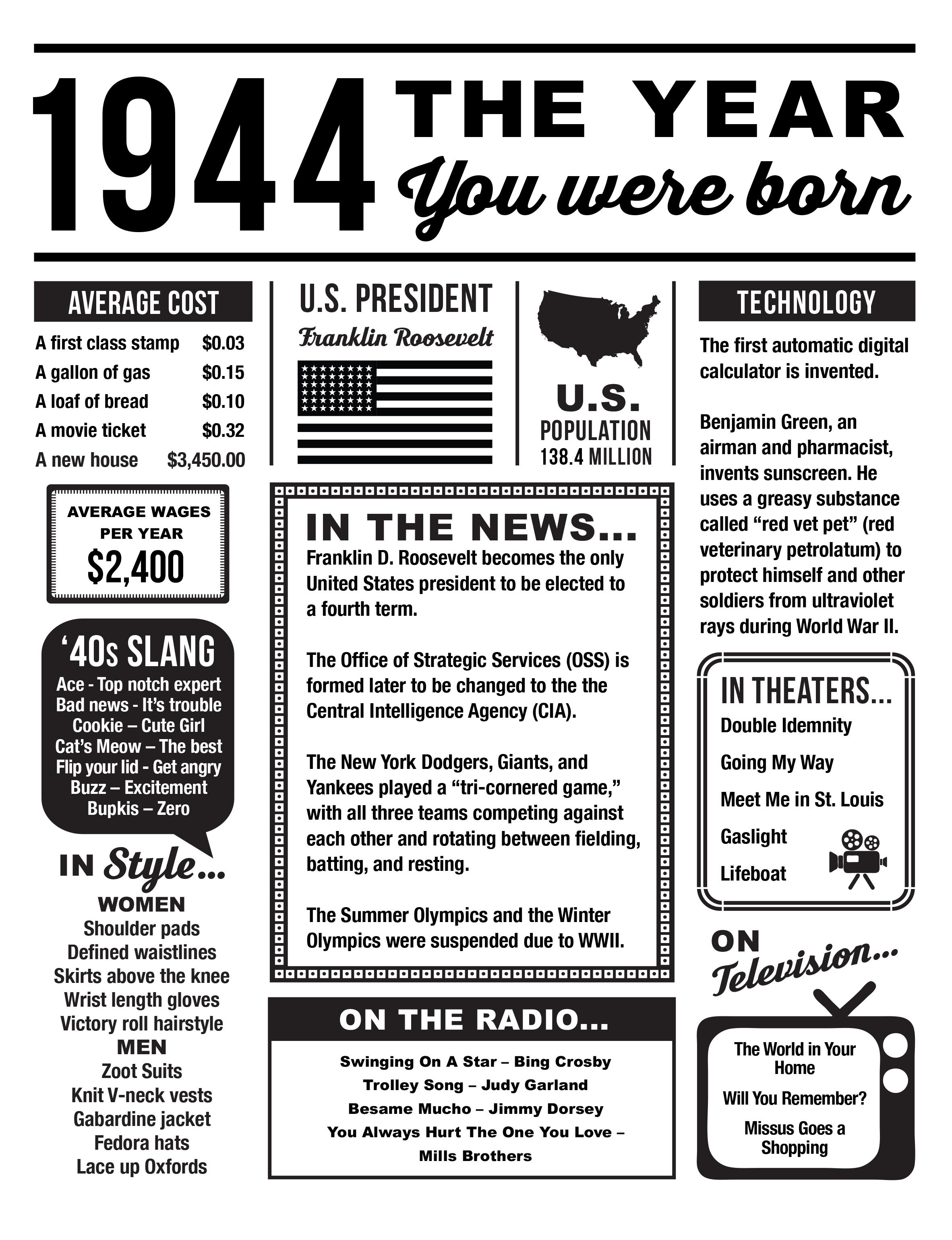 The Nazis surrendered on May 8, 1945, ending the war in the West. Also in 1945, the U.S. dropped two atomic bombs on Japan, forcing its surrender and ending the war in Asia. On Aug. 14, 1945, the U.S. celebrated “V-J Day,” or “Victory over Japan Day.” The end of the decade saw the formation of the United Nations and the “Baby Boom.” In non-war related events, FDR died (1945), the “Big Bang” Theory was formulated (1948) and the North Atlantic Trade Association (NATO) was established (1949).