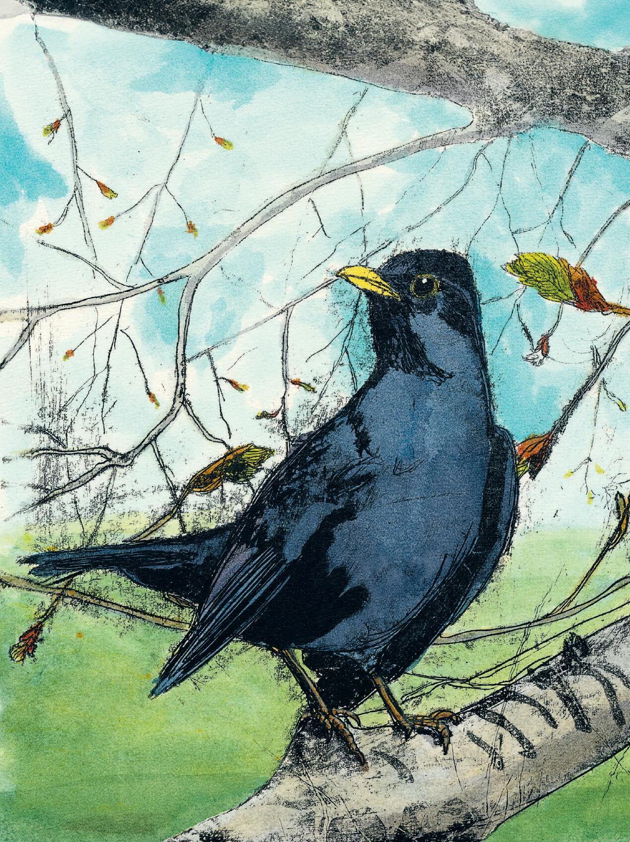 Mit elegantem Flügelschlag erö#net er das Repertoire allmorgendlicher Amselkunst.