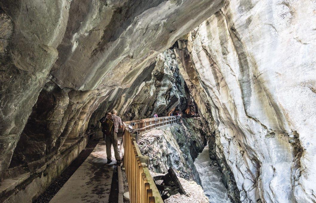 Eine Schlucht ist ein Spezialfall des V-Tals. Das Wasser frisst sich ebenfalls immer tiefer in den Fels ein, lässt die Seitenwände allerdings nahezu senkrecht stehen (was stabiles Gestein bedingt). Wenn sie nicht durch aufwändige Bauten touristisch erschlossen sind, gehören Schluchten zu den unwegsamsten Orten im Alpenraum und lassen sich oft nur mit Canyoningtechnik besuchen.