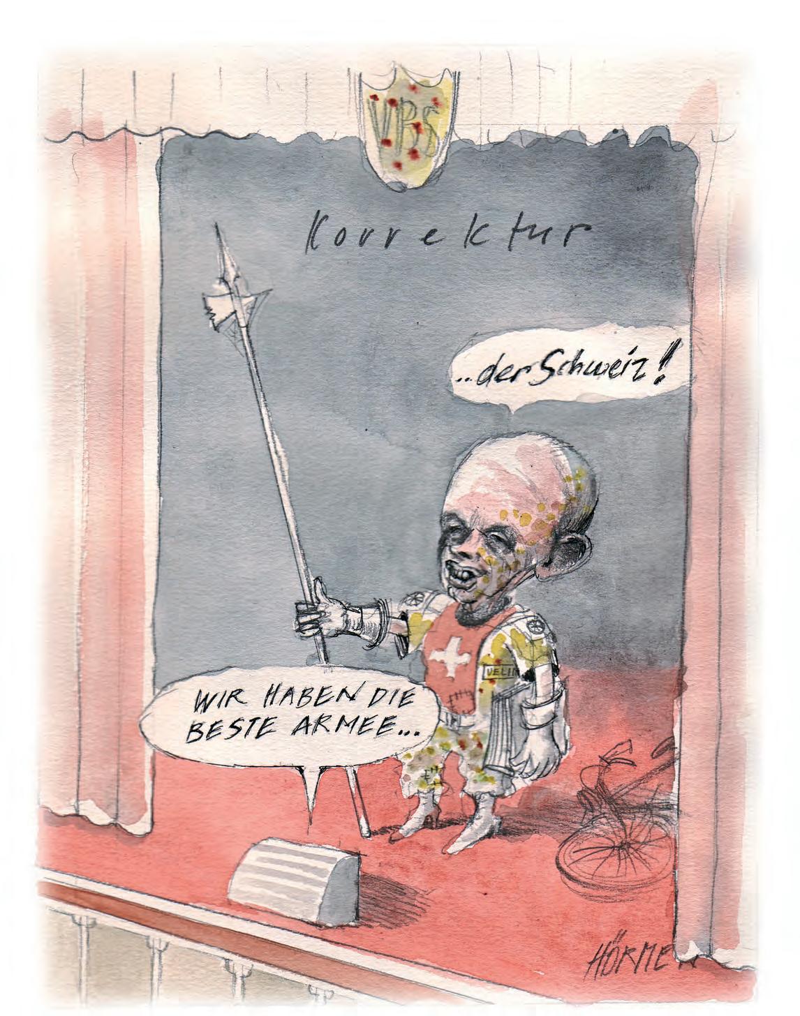 Einen Hermann Schmutz wird man hier, wo Unterhaltung reiner Selbstzweck ist und die gesellschaftspolitische Botschaft eine austauschbare Geste, wo neben dem Zuckerbrot auch die Peitsche aus Marzipan gebacken wird, vergeblich suchen. Denn Hörmen ist in meinen Augen einer der wenigen echten «gekränkten Idealisten» der Schweizer Karikaturszene – und nach den vorangegangenen Zeilen dürfte klar sein, weshalb das ausschliesslich als Kompliment zu verstehen ist. In seinen Arbeiten ist der 1943 geborene Thuner, der seit Mitte der siebziger Jahre regelmässig zur spitzen Feder greift und seit 1983 zum festen Nebelspalter-Inventar gehört, seiner Mission immer treu geblieben. In seinen Werken zeigt sich nicht nur der beharrliche Kämpfer – allem voran in seiner Sorge um unsere Umwelt – sondern auch ein sensibler Beobachter und ein begnadeter Zeichner. Dies und vielleicht auch die richtige Entscheidung, beruflich bei allem Erfolg nicht alles allein auf die Karte Pressezeichner zu setzen, sind die Gründe, weshalb sich in Hörmens Arbeiten nie die erstarrte Routine vieler Baukasten-Karikaturisten eingestellt hat, weshalb in seinen Zeichnungen fast immer das Ganze mehr ist als die Summe des Einzelnen. Man begegnet nicht formelhaften Konstrukten, sondern aus dem Papier heraus gearbeiteten Kompositionen, in denen die Energie ihres Entstehungsprozesses noch spürbar ist. Oder anders formuliert: Hörmens Trojanische Pferde haben – wie dieses Buch eindrücklich vermittelt – nicht allein «Aussenhülle» und «Frachtraum», sondern immer wieder auch eine Seele.