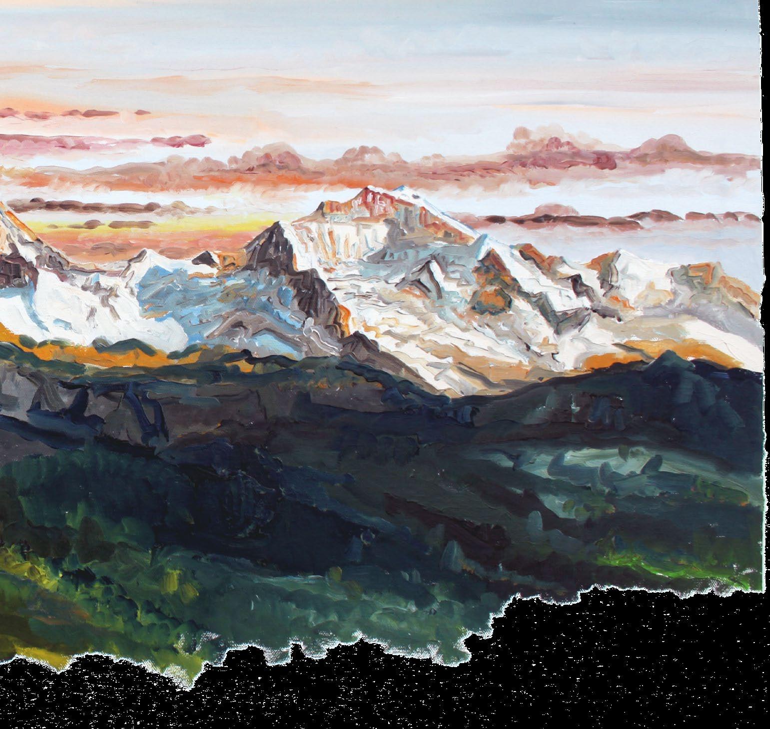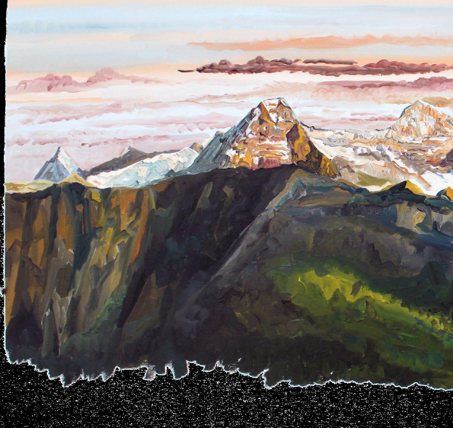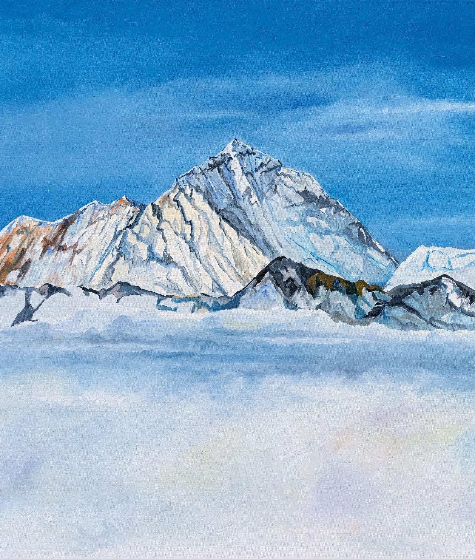 Berge – erobert, gemalt, verewigt Hans Jossi hat Berge erklommen, aber nicht um sie zu besteigen, sondern um sie auf Leinwand zu verewigen – der sicherere Weg, Höhenkrankheit zu umgehen ist, andere in die Todeszonen steigen zu lassen. Sein Opus Magnum ist ein monumentaler Gemäldezyklus aller 14 Achttausender im epischen Format von 120 !×! 100 cm, 2023 ferti g gestellt. Er nennt es seinen «Gipfelsturm der Malerei». Was nun mit dem übervollen Kunstlager? Die Freunde sagen: «Mach ’ne Ausstellung, Hans!»