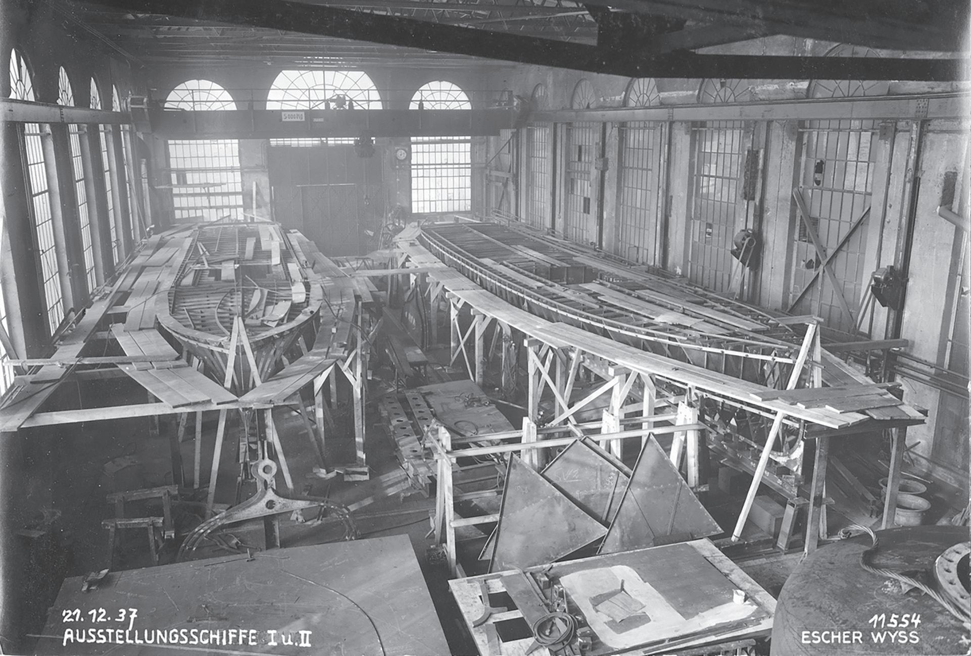 Die Ausstellungsschiffe entstehen in der Schiffbauhalle von Escher Wyss. Der Baufortschritt der Boote I und II scheint am 21. Dezember 1937 praktisch identisch zu sein. Die nachfolgenden Bilder zeigen klar, dass rechts das MS 300, also das LandiSchiff I, im Bau ist und links die Nr. 301, also Landi-Boot II, somit die «Ente», später «Oberhofen».