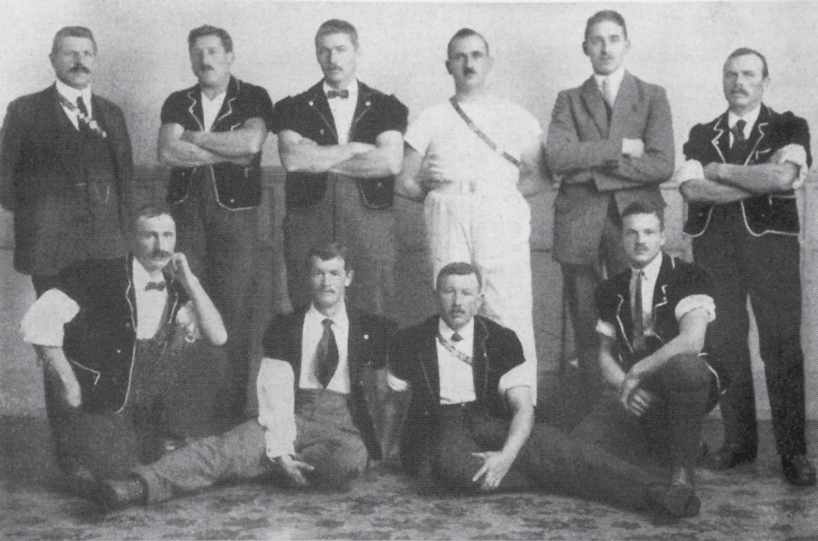 Dieses Bild aus der 1924 vom Oberländischen Schwingerverband herausgegebenen Chronik zeigt die Aktivschwinger der damaligen Zeit. Hintere Reihe von links nach rechts: Hans Gehret, Albert Betschen, Albert Wirth, Walter von Siebenthal (sitzend), Albert Oehrli, Hans Kohli. Vordere Reihe von links nach rechts: Gottfried Siegrist, Ernst Rüegger, Ernst Baumberger, Friedrich Meyes.