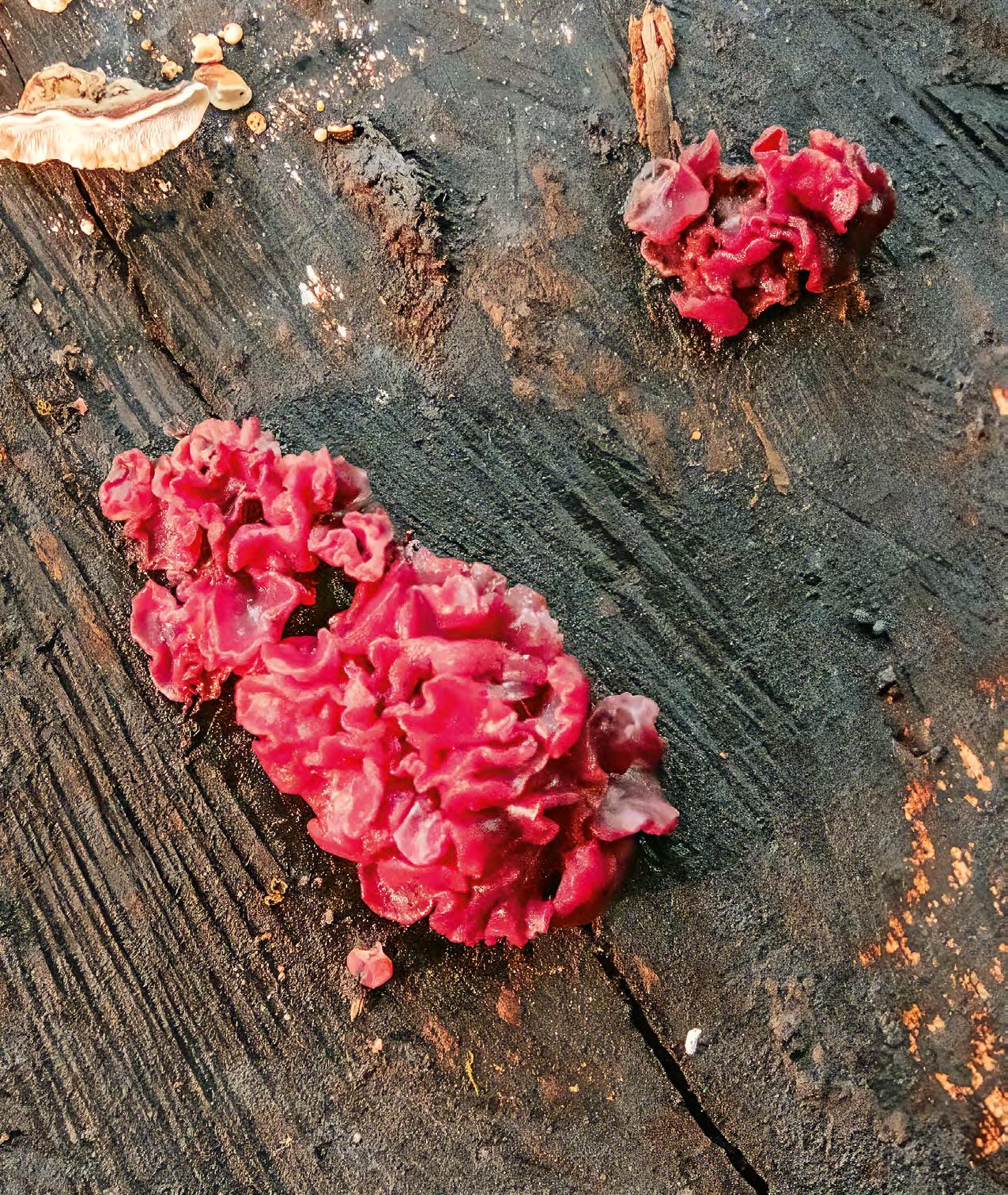 Eine eindeutige Pilzbestimmung ist von blossem Auge nicht immer möglich In diesem Fall sieht der Fleischrote Gallertbecher sehr