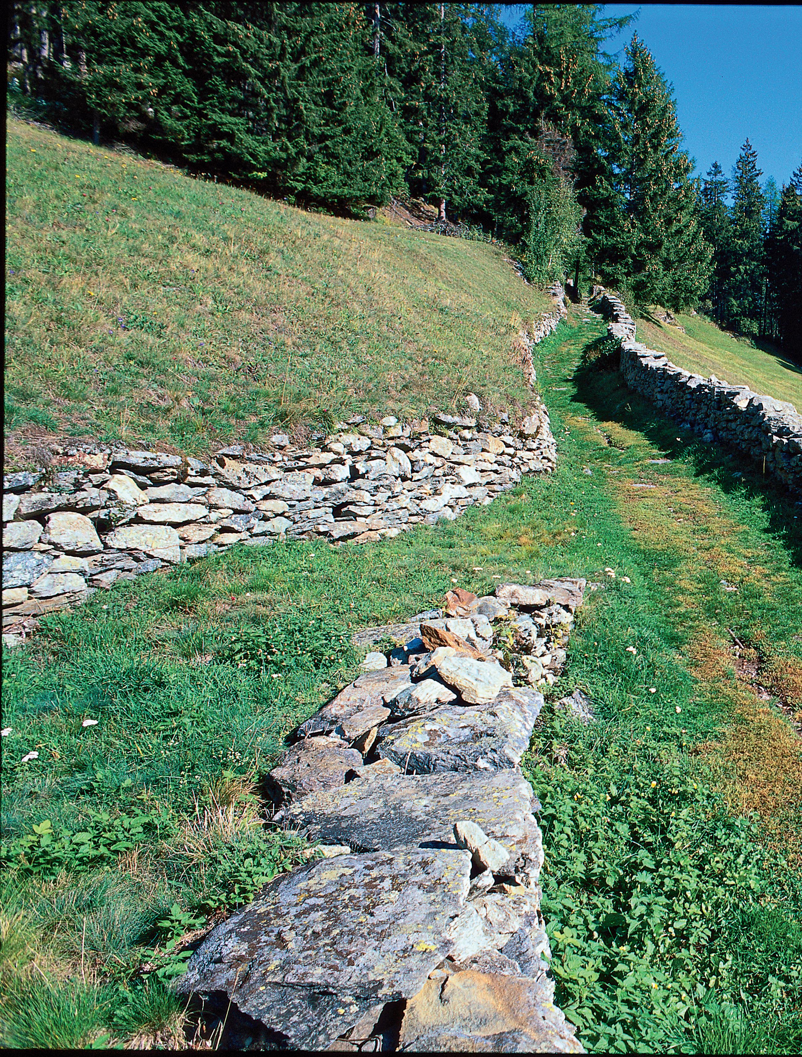 18 Als prächtige Gasse führt der Saumpfad durch das Kulturland bei Cadera oberhalb Poschiavo. Wie Steppnähte ziehen sich die Trockenmauern zum Schutz des Kulturlands durch die grünen Matten. Weil sie ein Biotop für Moose, Flechten, Insekten, Echsen, Wiesel und Hermeline sind, setzen sich heute Kulturschützer dafür ein, dass in einer traditionell gewachsenen Landschaft solch alte Mauern unbedingt erhalten bleiben.