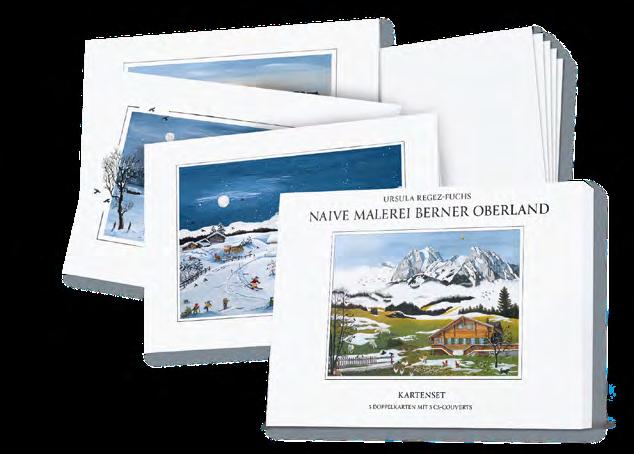 Lassen Sie auch Ihre Freundinnen und Freunde teilhaben an der vielseitigen Kunst von Ursula Regez-Fuchs – fünf bunte Postkarten mit herzerwärmenden Motiven der Naiven Malerei warten auf Ihre Nachricht. Jeder Postkarte liegt ein Couvert zum Versand bei.