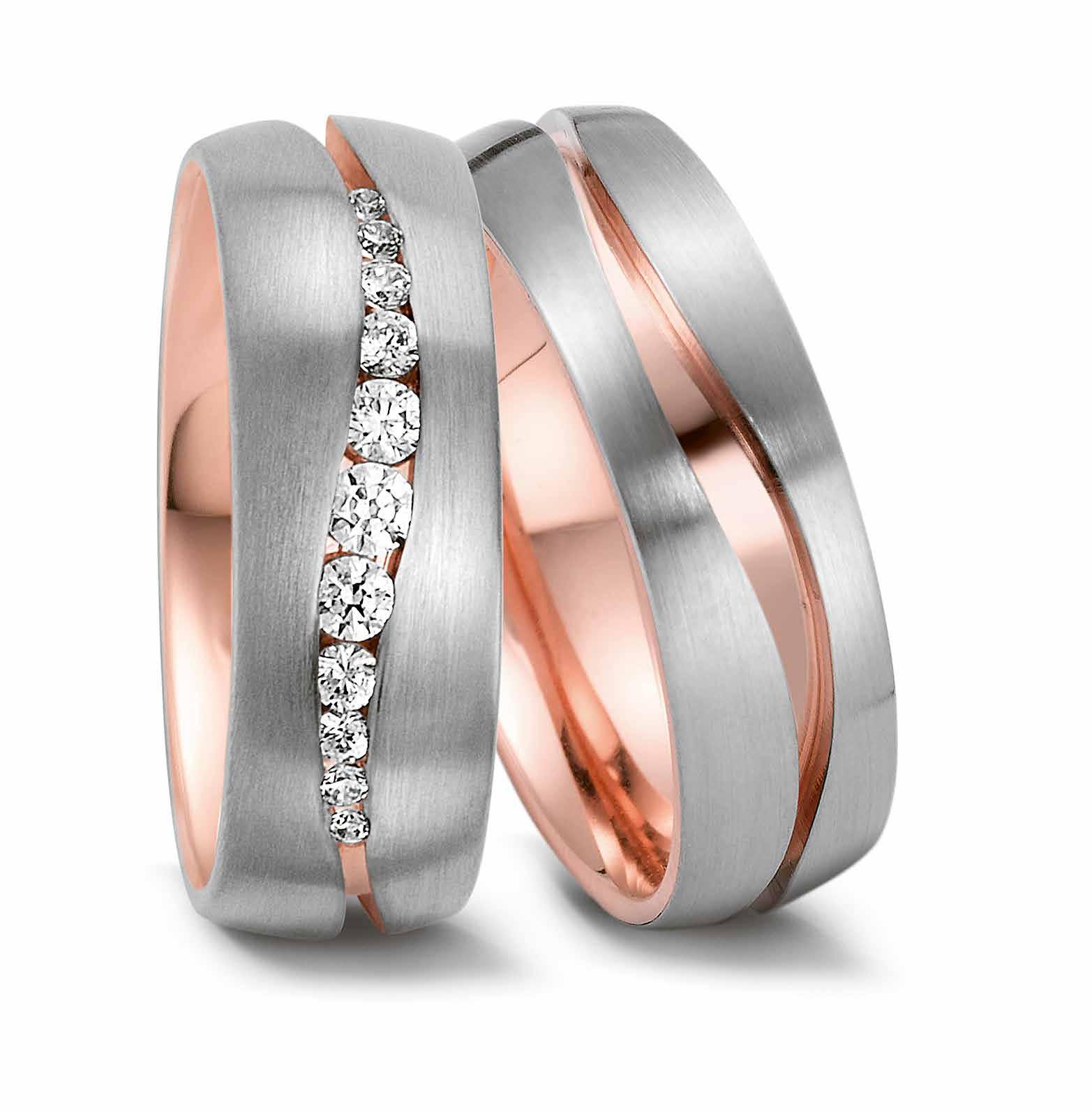 Aufregende Trauringe aus Weiss- und Rotgold mit funkelnden Diamanten.