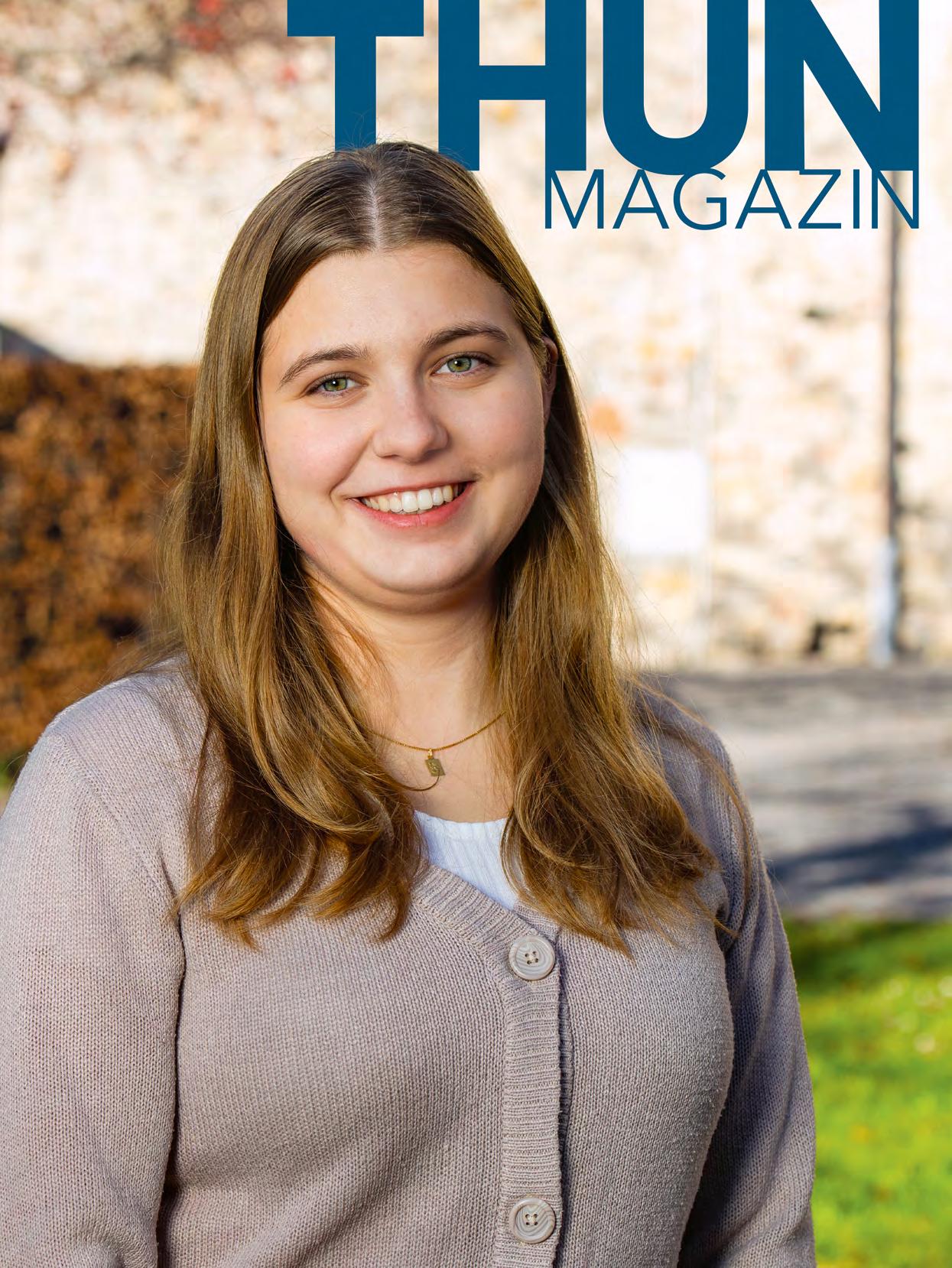 Herausgeberin: Stadt Thun, in Partnerschaft mit der Innenstadt-Genossenschaft THUNcity. Verlag, Konzept, Realisation: Weber Verlag AG, Werbeagentur und Verlag, Gwattstrasse 144, 3645 Gwatt, Tel. 033 336 55 55, E-Mail thun@weberverlag.ch. Leitung: Abteilung Stadt marketing und Kommunikation, Stadt Thun; THUNcity; Annette Weber, Weber Verlag AG. Inserate und Layout: Bettina Ogi, Weber Verlag AG. Stadtredaktion: Daniela Lüpold (Leitung), Ines Attinger, Tanja Beutler, Silvan Gertsch, Lea Hodler, Patrick Liechti, Miriam Margani, Gabriela Meister, Noah Oetterli. Beiträge, die mit dem Logo gekennzeichnet werden, sind redaktionelle Inhalte der Stadt ver waltung Thun. Redaktion THUNcity / weitere Beiträge: Weber Verlag AG. Titelbild: Miriam Kolmann. Auflage: 65 900 Exemplare. Erscheinungsweise: 6× jährlich. Druck: AVD Goldach AG, Goldach. Papier: Umschlag: 150 g/m2, weiss, matt, holzfrei. Inhalt: 57 g/m2, Holmen View matt 1.4 Vol. ungestrichen. Lese- App: Gratis-Download im App Store. Nächste Ausgabe: 23. /24. April. ISSN 1662-0992.