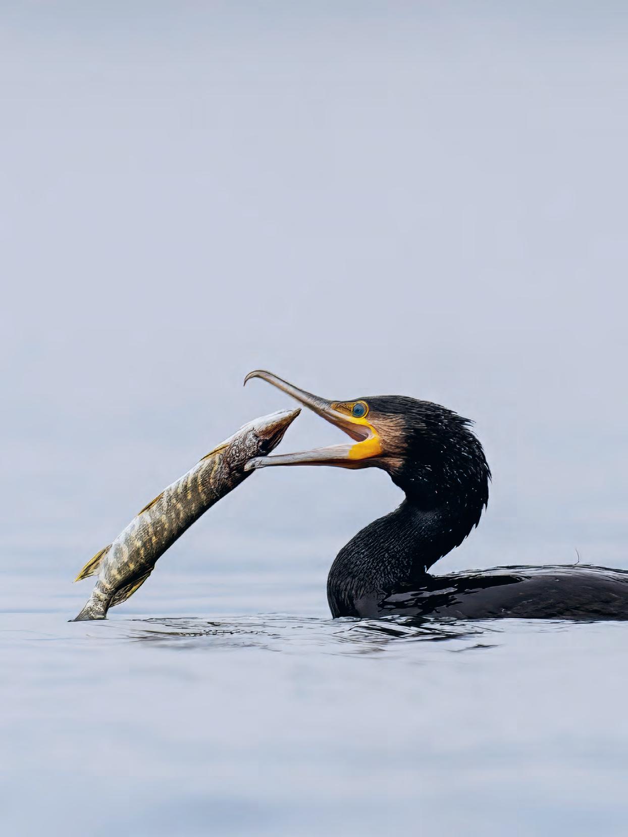 Kormoran mit Hecht –Kormorane sind gute Taucher und jagen mehrere Meter unter Wasser flink und sehr aktiv nach Fischen.