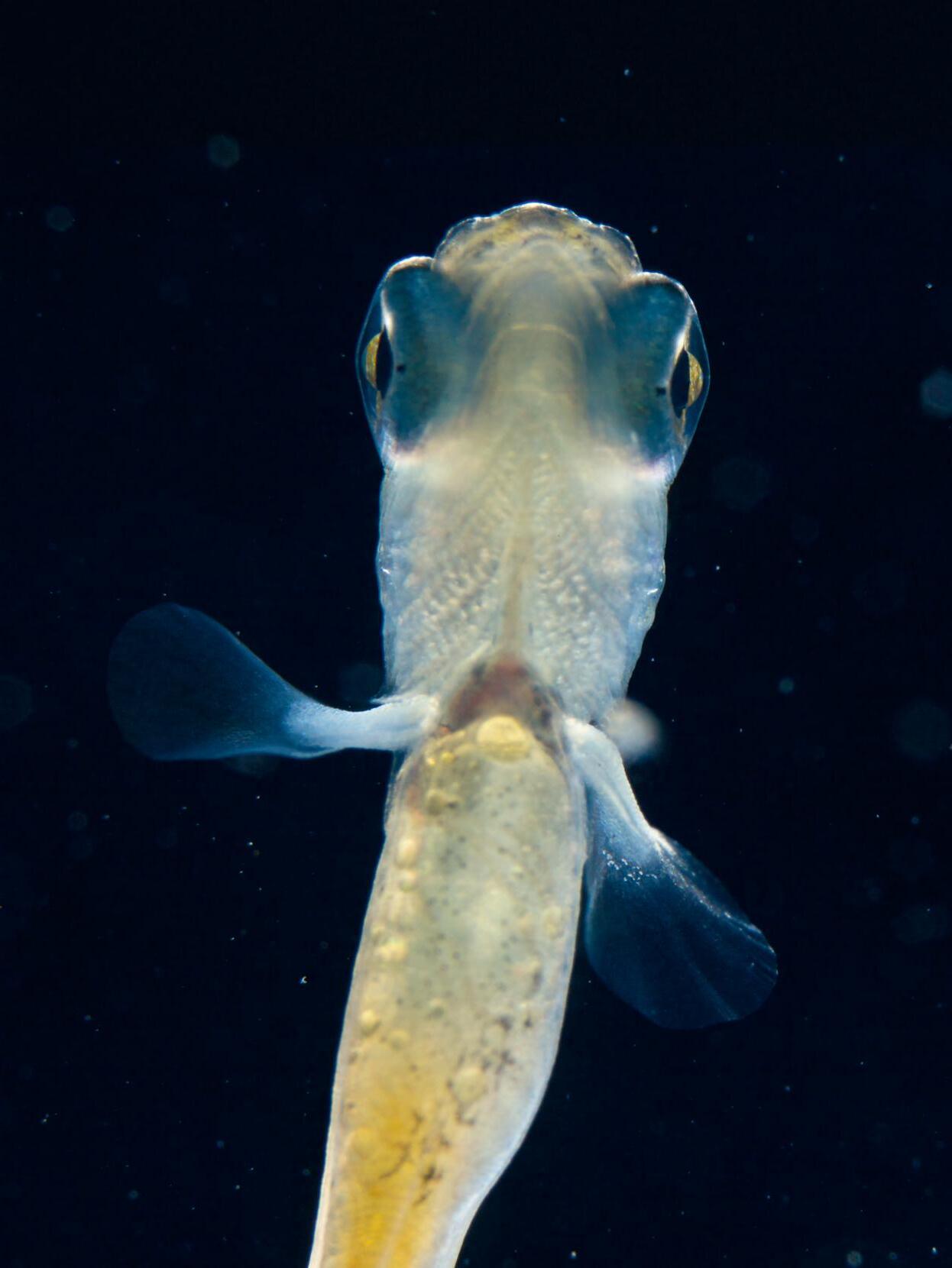 Larve einer Äsche –wagt sich langsam aus dem schützenden Kiesgrund.
