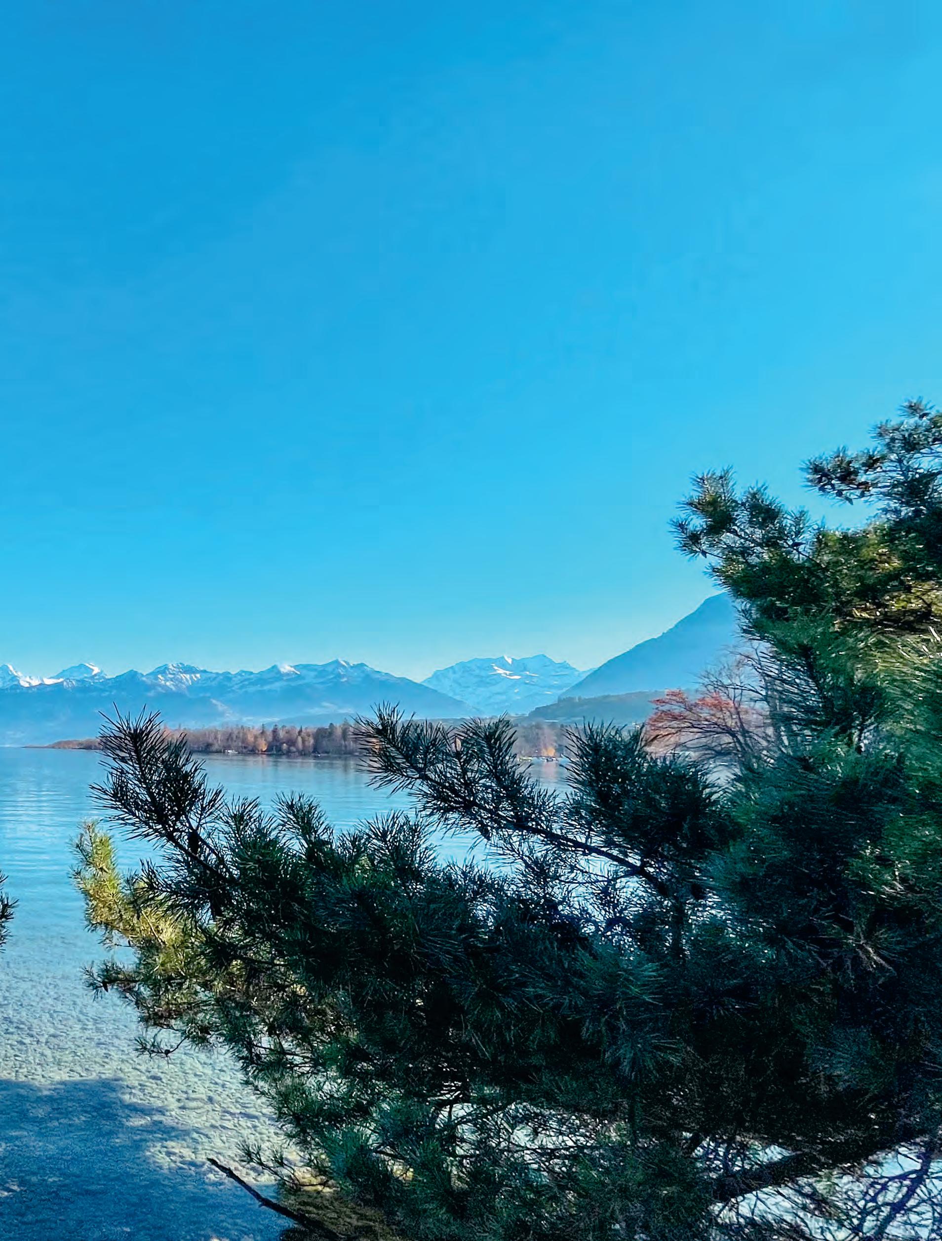 Vor dem kalten, klaren Himmel glitzern die schneebedeckten Bergspitzen im Sonnenlicht, während der Thunersee in tiefem Blau ruht und der Frost die Ufer in zarte Eiskristalle hüllt. Und wenn sich der Schnee auch in tiefere Gefilde getraut, verwandelt sich die Region in eine märchenhafte Winterlandschaft. Ein Spaziergang entlang des Sees in den frühen Morgenstunden, wenn der Nebel noch wie ein S chleier über dem Wasser liegt, vermittelt eine besondere Winterstimmung. Die Natur scheint in sich gekehrt, alles wirkt friedlich und in einer Art Winterruhe. Das knirschende Geräusch des Schnees u nter den Füssen und der klare Duft der kalten Luft wecken Erinnerungen an vergangene Winter. Was jedes Mal aufs Neue eindrücklich ist, sind die verschiedenen Lichtstimmungen. Und egal ob Sonnenaufgang oder Sonnenuntergang – das Farbenspiel verleiht dem See und seiner Umgebung etwas