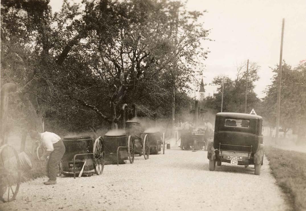3 Herstellung eines sogenannten Spramexbelags auf der Berner Kantonsstrasse Mühleberg–Frauenkappelen durch die «Schweizerische Strassenbau- und TiefbauUnternehmung AG» «Stuag» im Jahr 1927. (Archiv Josef Murmann)