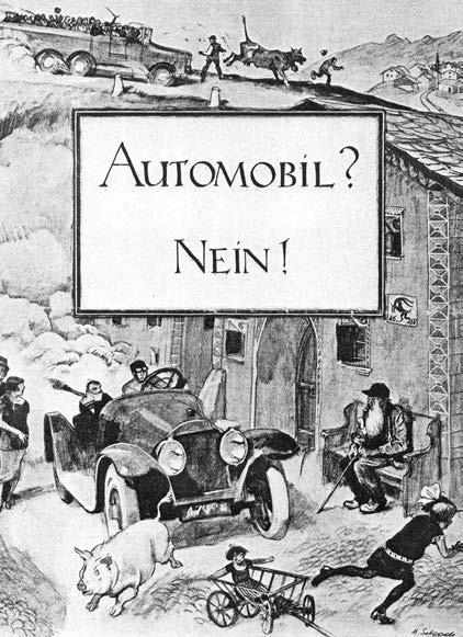 2 In der Frühzeit der Motorisierung bildeten die Gefährlichkeit der Motorfahrzeuge, die Angst der traditionellen Verkehrsgewerbe vor neuer Konkurrenz sowie Abgase, Staubwolken und Motorenlärm die Basis einer verbreiteten Ablehnung der Automobile. Im Bild die Flugschrift aus dem Abstimmungskampf um die Aufhebung des Automobilverbots im Kanton Graubünden im Jahr 1925. Es war der zehnte Versuch, das Verbot aufzuheben. Dieser sollte nun erfolgreich sein.