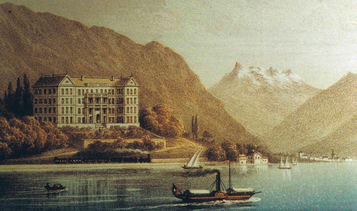 Das Hotel Byron bei Villeneuve in einer frĂŒhen Darstellung um 1840.