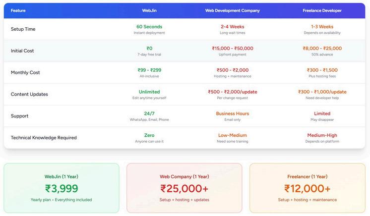 As India's most affordable website as a service India platform, WebJin delivers ready-made themes, built-in WhatsApp chat, contact forms, and Google Maps business website integration all without hiring a developer.