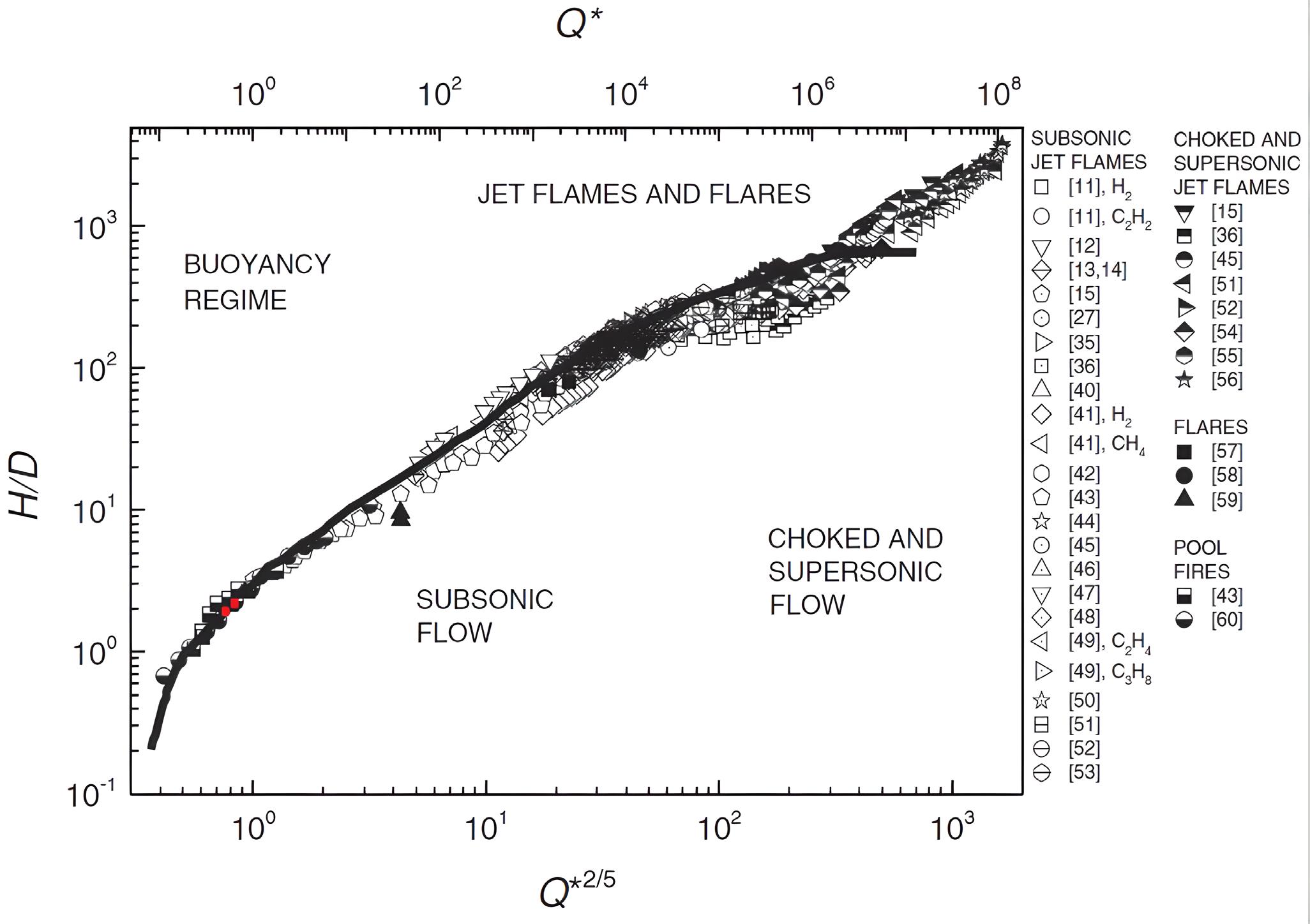 Figura 18. Altura de llama normalizada, H/D, en función de Q*(*2/5). Modificada de Bradley et al (2016). Los cuadrados rojos muestran los valores experimentales obtenidos en el presente estudio: H/D = 2.0, Q*=0.5 y H/D = 2.3, Q* = 0.67 para los casos 1 y 2, respectivamente.