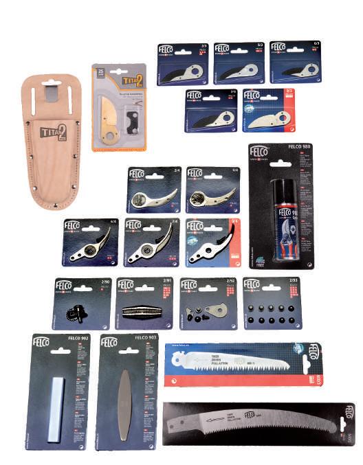 74 Gereedschap voor de vakman 2023 A B C D 1. 150 83 00 Snoeischaar FELCO 2 INCLUSIEF RESERVE BOVENMES 240 gr. 2. 150 83 15 Snoeischaar FELCO 4 Eenvoudiger model 220 gr. 3. 150 83 40 Snoeischaar FELCO 5 Basis model van staal 310 gr. 4. 150 83 30 Snoeischaar FELCO 6 Compact voor kleine handen 210 gr. 5. 150 83 10 Snoeischaar FELCO 7 Ergonomisch met rolhandgreep 290 gr. 6. 150 83 50 Snoeischaar FELCO 8 Ergonomisch zonder rolhandgreep 210 gr. 7. 150 83 20 Snoeischaar FELCO 9 Als Felco 8 maar linkshandig 245 gr. 8. 150 83 55 Snoeischaar FELCO 10 Als Felco 7 maar linkshandig met rolhandgreep 290 gr. 9. 150 83 60 Snoeischaar FELCO 11 Als Felco 2 met een smaller ondermes 245 gr. 10. 150 83 61 Snoeischaar FELCO 12 Voor kleine handen met handige rolhandgreep 265 gr. 11. 150 83 65 Snoeischaar FELCO 13 Te gebruiken met twee handen 310 gr. 12. 150 83 57 Snoeischaar FELCO 14 Als Felco 6 Klein model, zeer compact 195 gr. 13. 150 84 95 Holster FELCO 912 Echt leder, met clip 65 gr. 14. 150 84 90 Holster FELCO 910 Echt leder, met sleuven en clip 110 gr. 15. 150 85 20 Heggenschaar FELCO F 250-57 900 gr. 16. 150 84 50 Takkenschaar FELCO F 211-40 Lichtgewicht aluminium 40cm knipt tot 35 mm 715 gr. 17. 150 84 54 Takkenschaar FELCO F 211-60 Lichtgewicht aluminium 60cm knipt tot 35 mm 885 gr. 150 84 58 Takkenschaar FELCO F 211-80 Lichtgewicht aluminium 80cm knipt tot 45 mm 1250 gr. 18. 150 85 40 Staaldraad tang FELCO C 7 Knipt staaldraad tot 7 mm 270 gr. 150 85 45 Staaldraad tang FELCO C 9 Knipt staaldraad tot 9 mm 490 gr. 19. 150 85 50 Draad en kabel tang FELCO C 12 Knipt staaldraad tot 12 mm 1500 gr. 150 85 60 Draad en kabel tang FELCO C 16 Knipt staaldraad tot 16 mm 2300 gr. 20. 150 83 70 Trekzaag FELCO F 600 met 16 cm zaagblad Inklapbaar 160 gr. 21. 150 83 91 Trekzaag FELCO F 621 met 24 cm zaagblad recht 200 gr. 22. 150 83 80 Trekzaag FELCO F 640 met 27 cm zaagblad gebogen 365 gr. 23. 156 00 02 Snoeischaar TITAN 2 Professionele kwaliteit. Bovenmes met Titanium coating 265 gr. 24. 150 85 08 Oogstschaar FELCO F 321 Oogstschaar - Stekschaar 177 mm met verchroomde messen 110 gr. 25. 150 85 00 Fruitschaar - bloemenschaar FELCO 310 110 gr. 26. 150 87 11 Kniebeschermer FELCO F 711 Kniebeschermer per paar 27. 150 84 80 Zwitsers zakmes FELCO F 500 Zwitsers zakmes met drie functies 60 gr. 28. 150 83 97 Multifunctioneel mes - Entmes FELCO 3.90 50 55 gr. 29. 150 84 00 Schapenhoefschaar FELCO 51 voor kleinvee hoeven 260 gr. 30. 156 01 04 Holster voor TITAN 2 snoeischaar, echt leder met sleuven en clip 31. 156 01 02 Bovenmes voor TITAN 2 snoeischaar met Titanium coating 32. 150 83 04 Bovenmes 2/3 voor FELCO 2 - 4 en 11 33. 150 83 44 Bovenmes 5/3 voor FELCO 5 34. 150 83 34 Bovenmes 6/3 voor FELCO 6 en 12 35. 150 83 14 Bovenmes 7/3 voor FELCO 7 en 8 36. 150 83 24 Bovenmes 9/3 voor FELCO 9 en 10 37. 150 83 06 Ondermes 2/4 voor FELCO 2 met klinknagels 38. 150 83 18 Ondermes