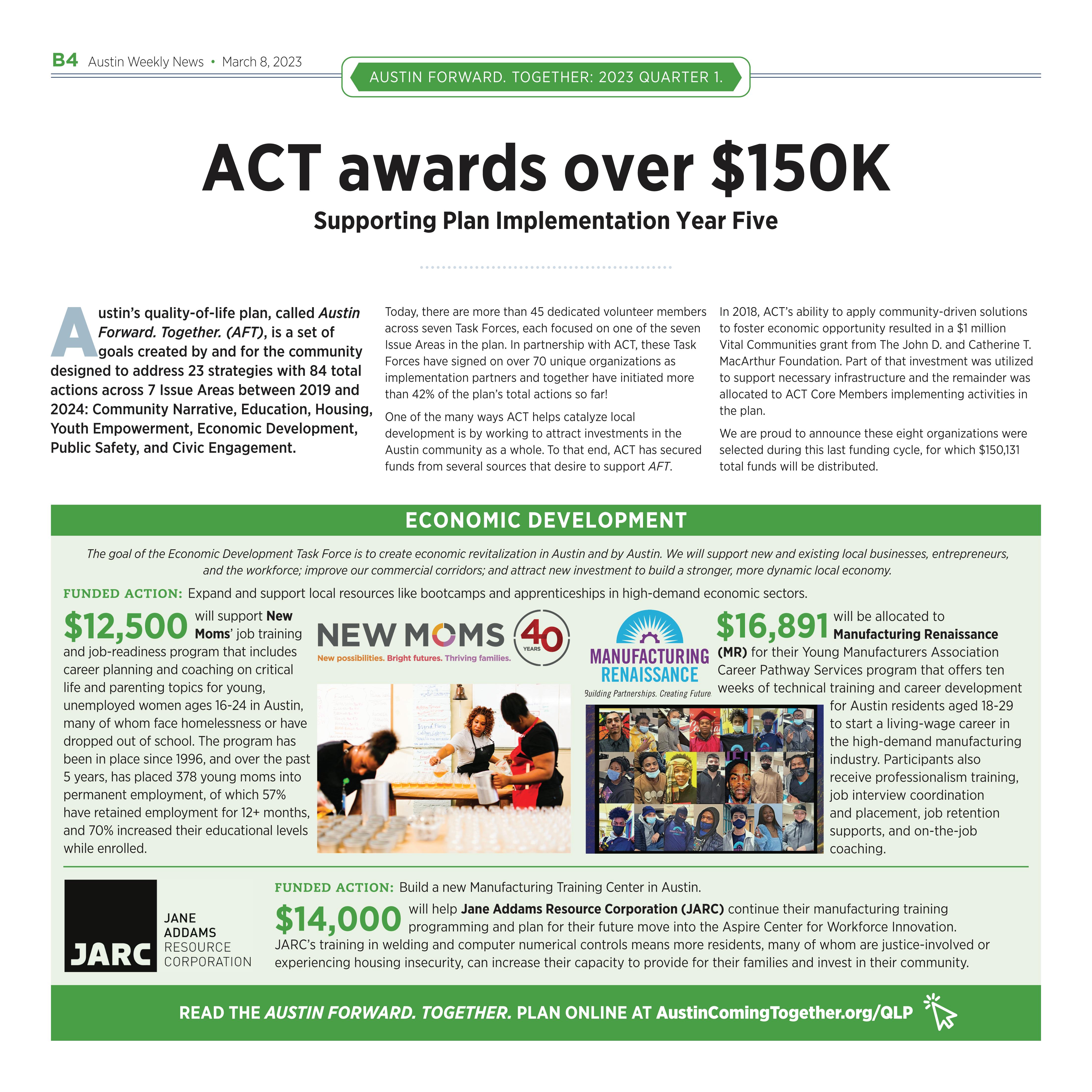 THE AUSTIN COMMUNITY PUBLISHED ITS FIRST QUALITY-OF-LIFE PLAN CALLED AUSTIN FORWARD. TOGETHER. (AFT) IN 2018. THIS QUARTERLY PUBLICATION DESCRIBES HOW AUSTIN COMING TOGETHER (ACT) IS SUPPORTING THE COMMUNITY TO IMPLEMENT AFT AND OTHER EFFORTS.