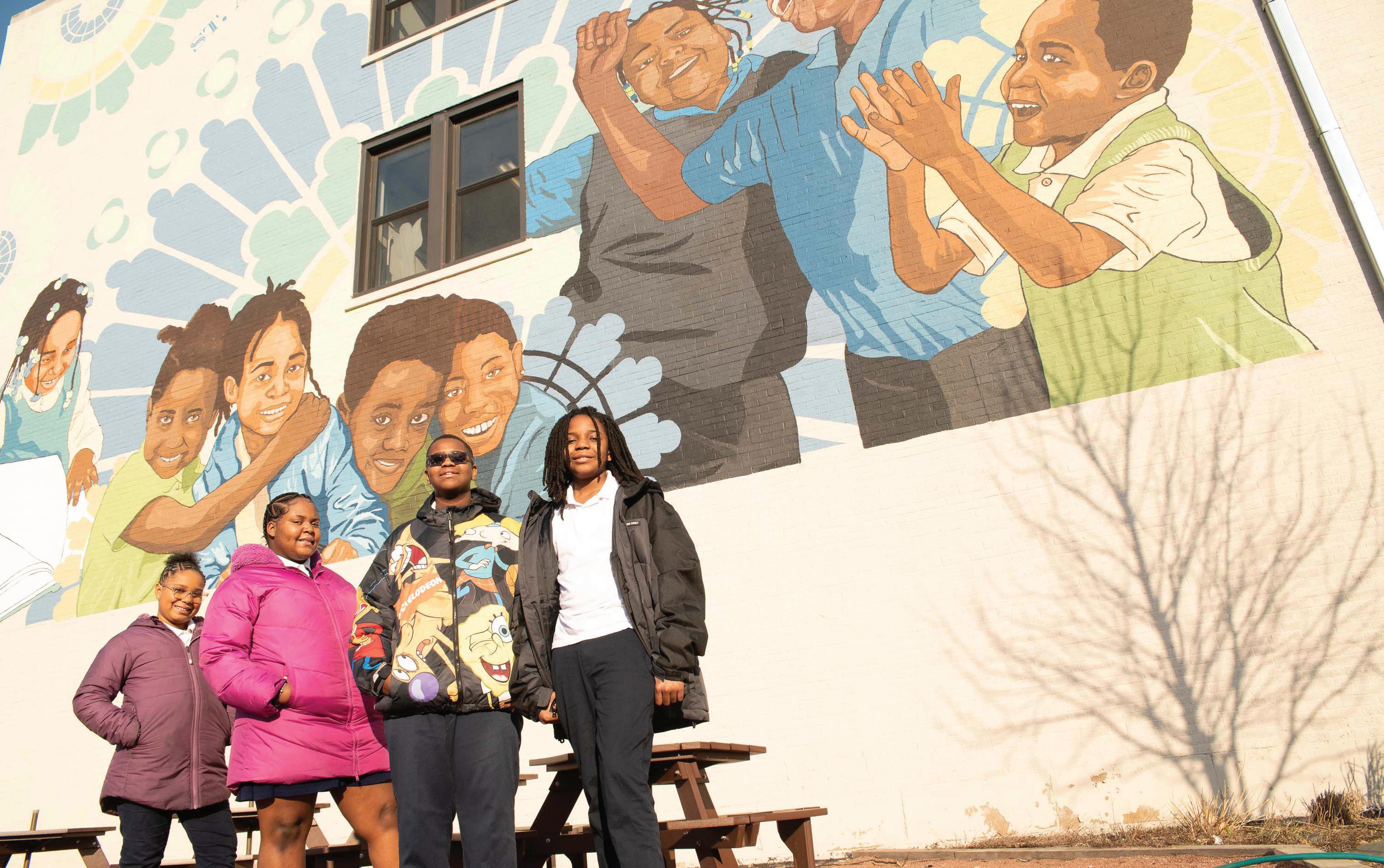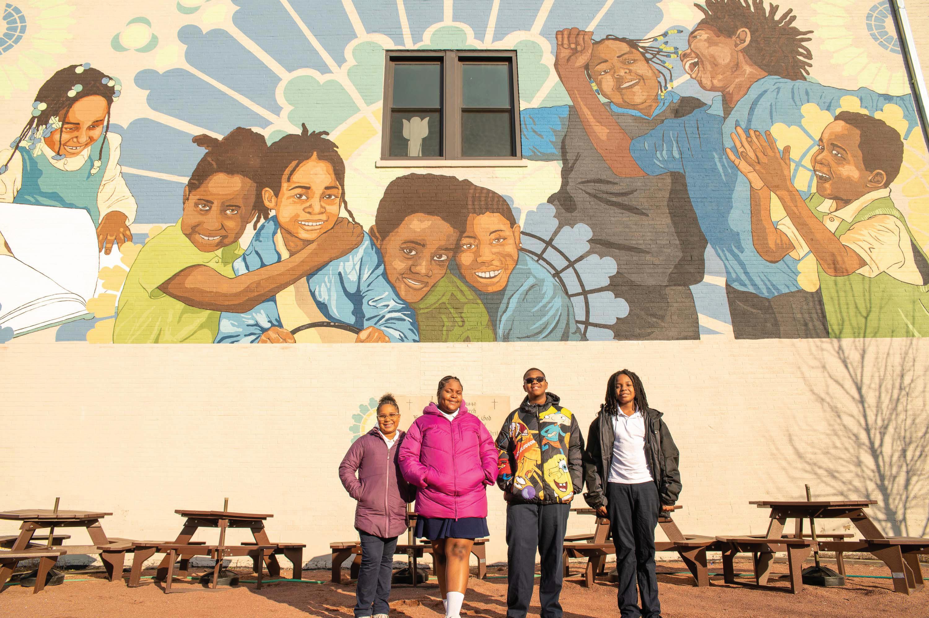 St. Angela S chool students (le to right) Xaria Johnson Rickett, 11, Malia Jones, 13, Isaiah Stines, 13, and Amares Chambliss, 13, in front of the new mural that features there faces.