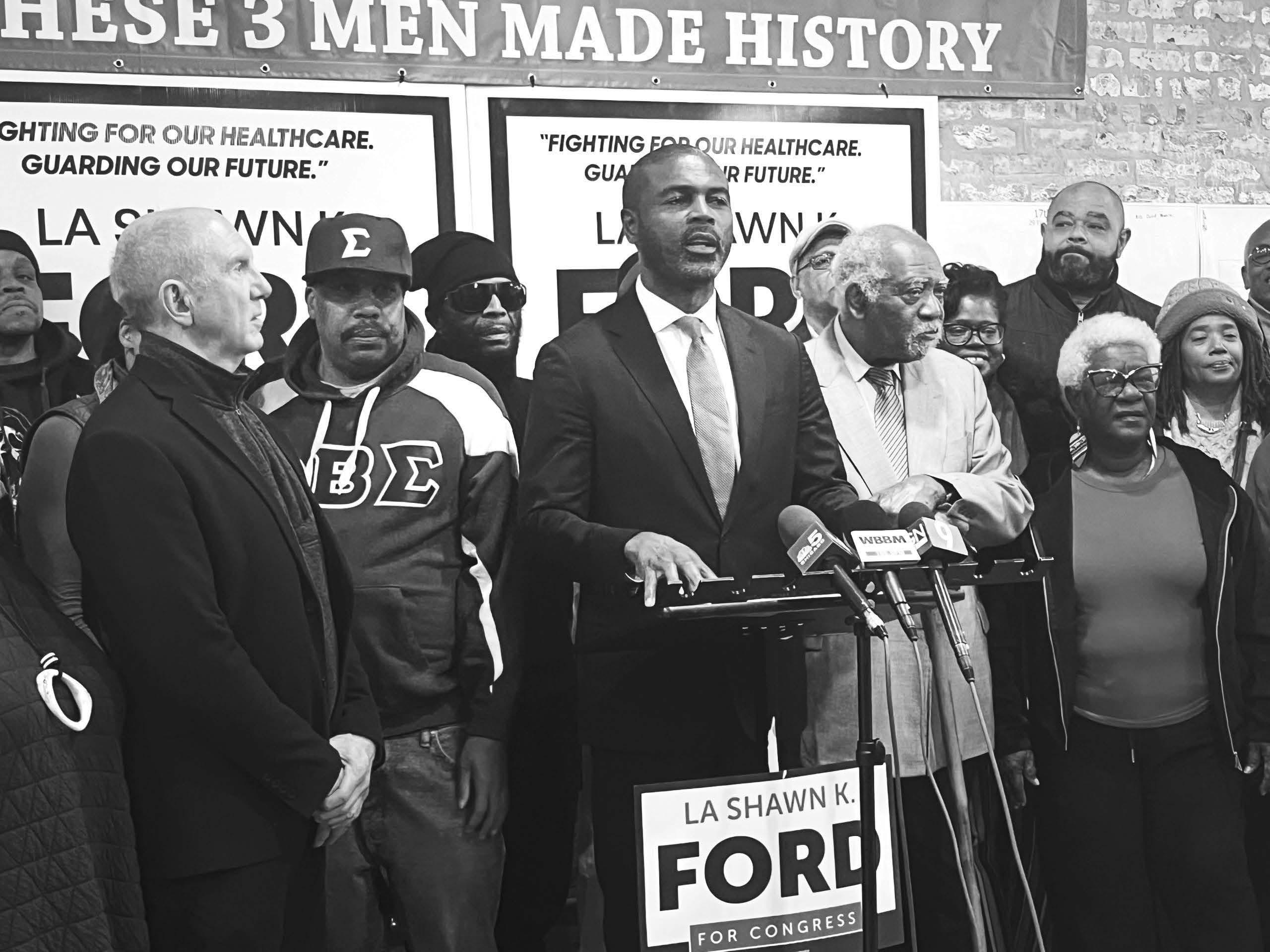Surrounded by suppor ters, including Cong ressman Danny K. Davis, 7th District Congressional candidate La Shaw n K. Ford addresses the media on Feb. 25, regarding the contents of an attack ad by a cr ypto currency PAC circulating in the dist rict.