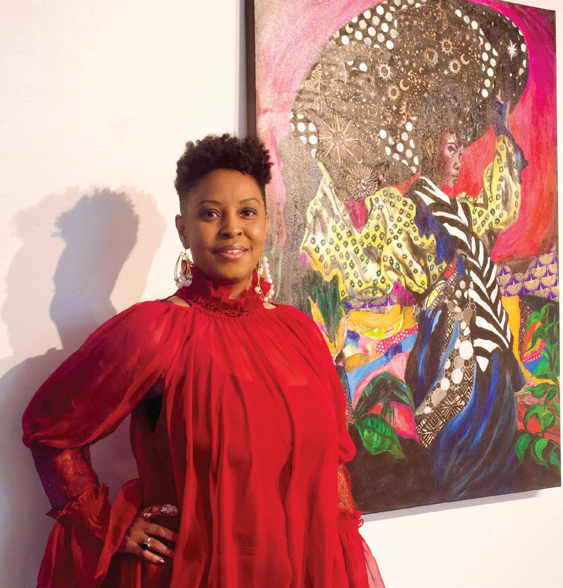 The gallery is filled with creative portraits and sculptures of Black women that evoke traditional African patter ns and celestial representations of powerful icons