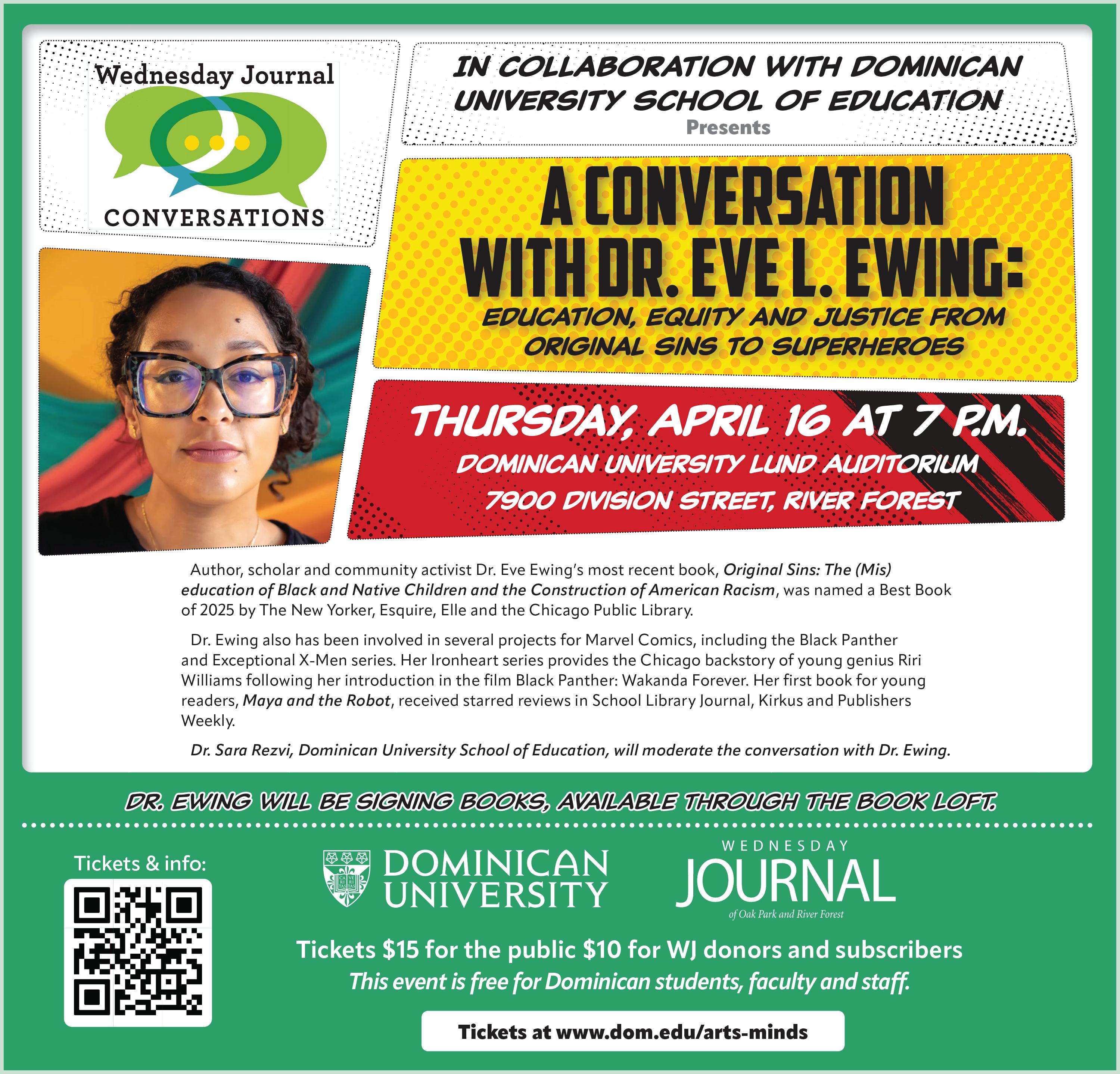 That’s why on Thursday, April 16 Wednesday Journal is partnering with Dominican University’s school of education to host a community talk exploring the intersections of society, diversity and academia. T he discussion will be held at 7 p.m. at the university’s Lund Auditorium inside the Performing Arts Center, 7900 W. Division St