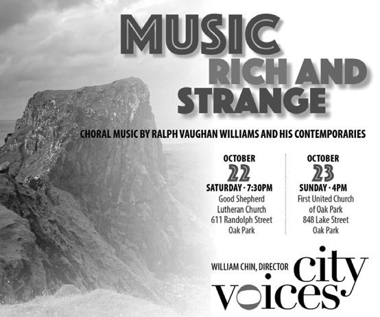 turday, Oc t. 22, 7:30 p.m., Good Shepherd Lutheran Church unday, Oc t. 23, 4 p.m., First United Church of Oak Park oices celebrates the music of composer Ralph Vaughan Williams and inzi. $20 (18 and under are free). oicesmusicrichandstrange.bpt.me/ 611 Randolph, Oak Park and 848 Lake St., Oak Park.