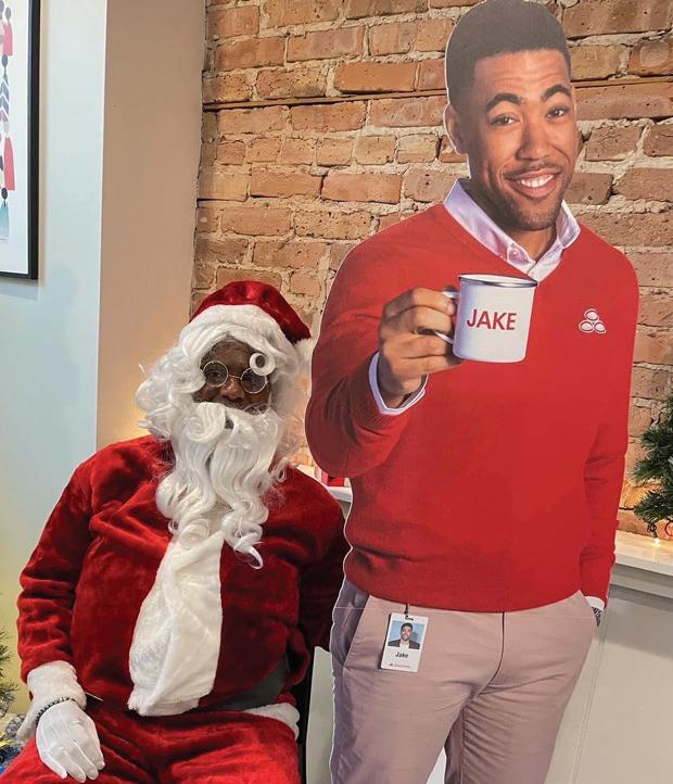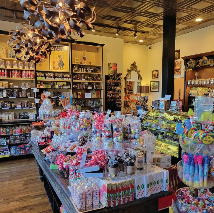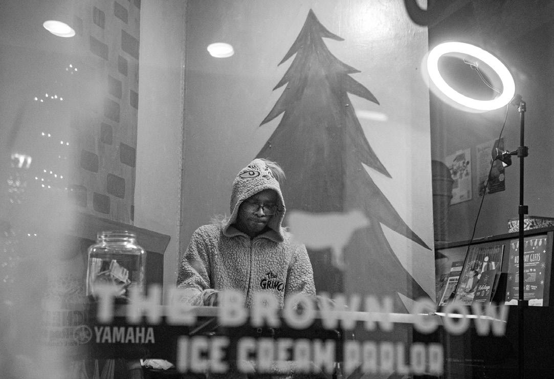 At the Forest Park Holiday Walk, Friday night on Madison (clockwise from top le ) families take holiday photos outside of Kribi Co ee; listening to live per formances at Centuries & Sleuths; the Grinch plays music inside the Brown Cow ; strolling strollers check out Jeanine Guncheon Etcetera’s storefront w indow.