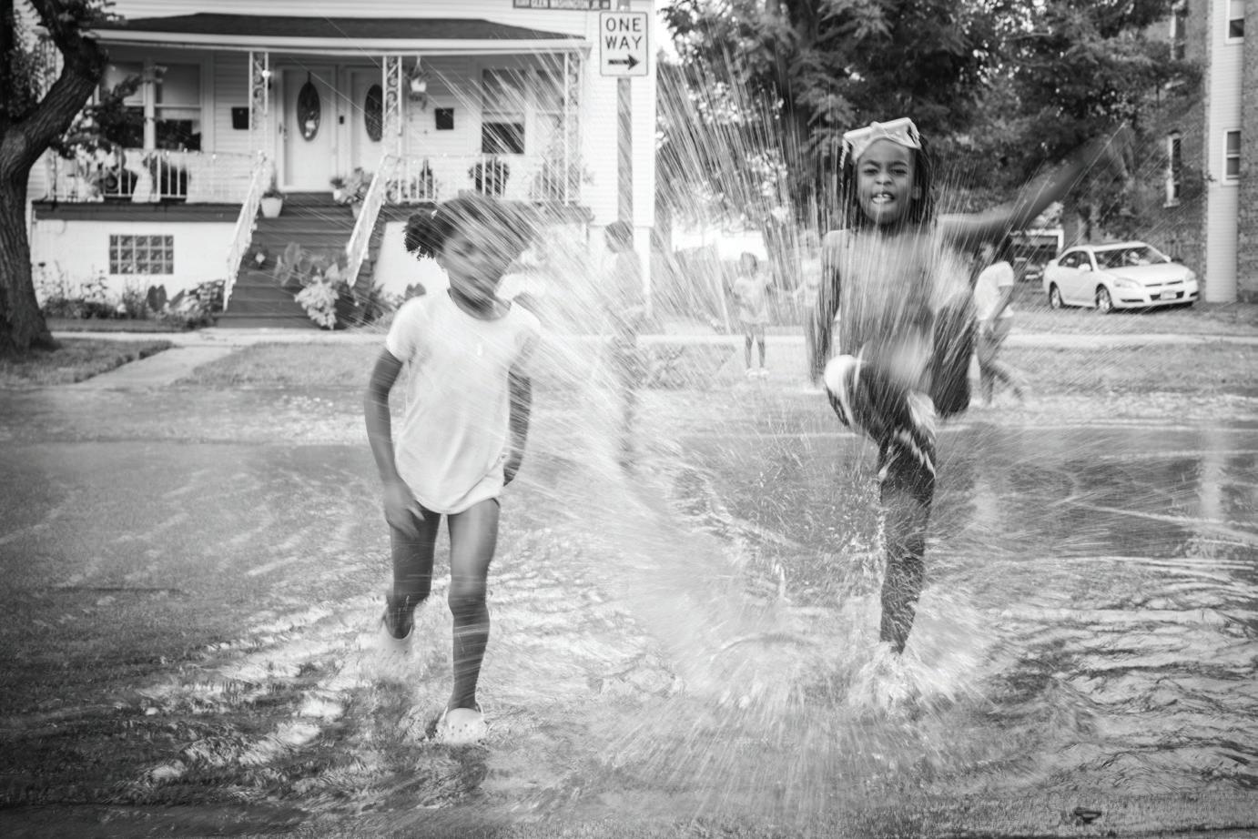 SPLASH , CHIC AG O ’S WESTSIDE, 2024: Children play on a hot summer day, running through sprinklers and chasing laughter across the street.