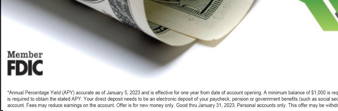 A er auto the spree, village making devices available at no cost *AnnualPercentage Yield(APY)accurateasofMarch2,2023andissubjecttochange.Aminimumof$1,000is requiredtoopentheaccountandtoobtainthestatedAPY.Feesmay reduce earningsontheaccount.Apenaltymaybeimposedfor earlywithdrawal.Offerisfornewmoneyonly. 7MonthCertificateofDeposit 4 84% APY* 7MonthCertificateofDeposit IT’S HERE 4.84% APY *