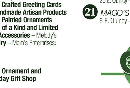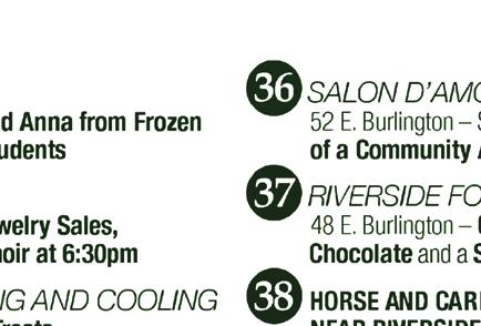 Lastly, along East Quincy Street, visit Magos Styling Cafe, 6 E. Quincy St., for holiday music and candy; be wowed by Indianabased Northern Exposure Chainsaw Carving’s custom wood carvings and hop aboard a pony cart ride at Jeff ’s Auto & Truck Re pair, 20 E. Quincy St.; savor churros and Mexican hot chocolate at Black Book Studio, 33 E. Quincy St.; swig a hot apple cider (both alcoholic and non-alcoholic versions) at Quincy Street Distillery, 39 E. Quincy St.; and keep the kids entertained with crafts, music and holiday activities at Riverside’s Parks and Recreation Community Center, 43 E. Quincy St.