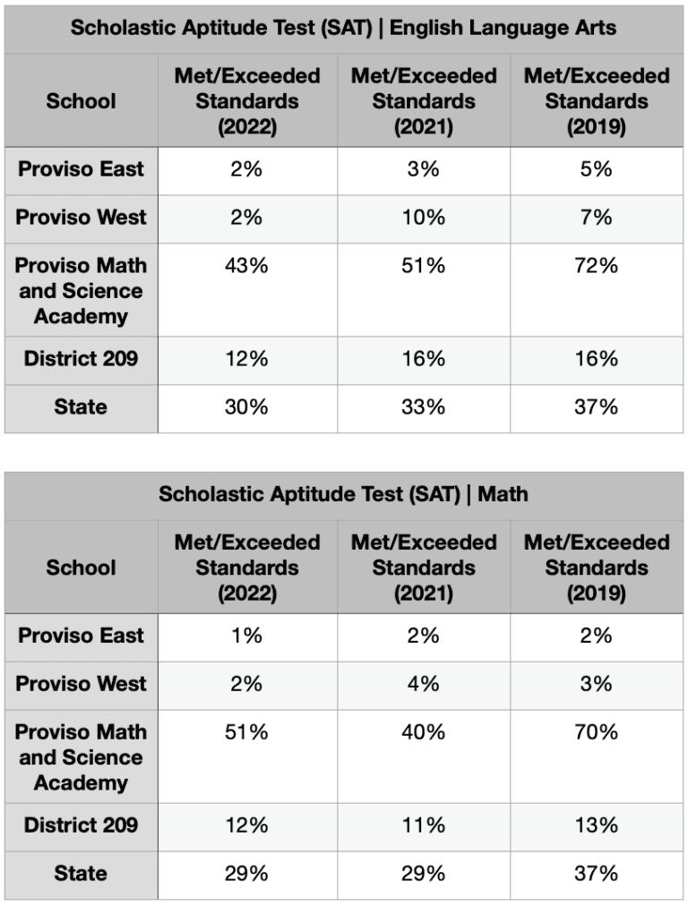 In 2022, the percentage of students meeting or exceeding standards on the ELA portion of the SAT was 2% at Proviso East and Proviso West and 43% at Proviso Math and Science Academy (PMSA). Across the district, the average was 12% and the state average was 30%.