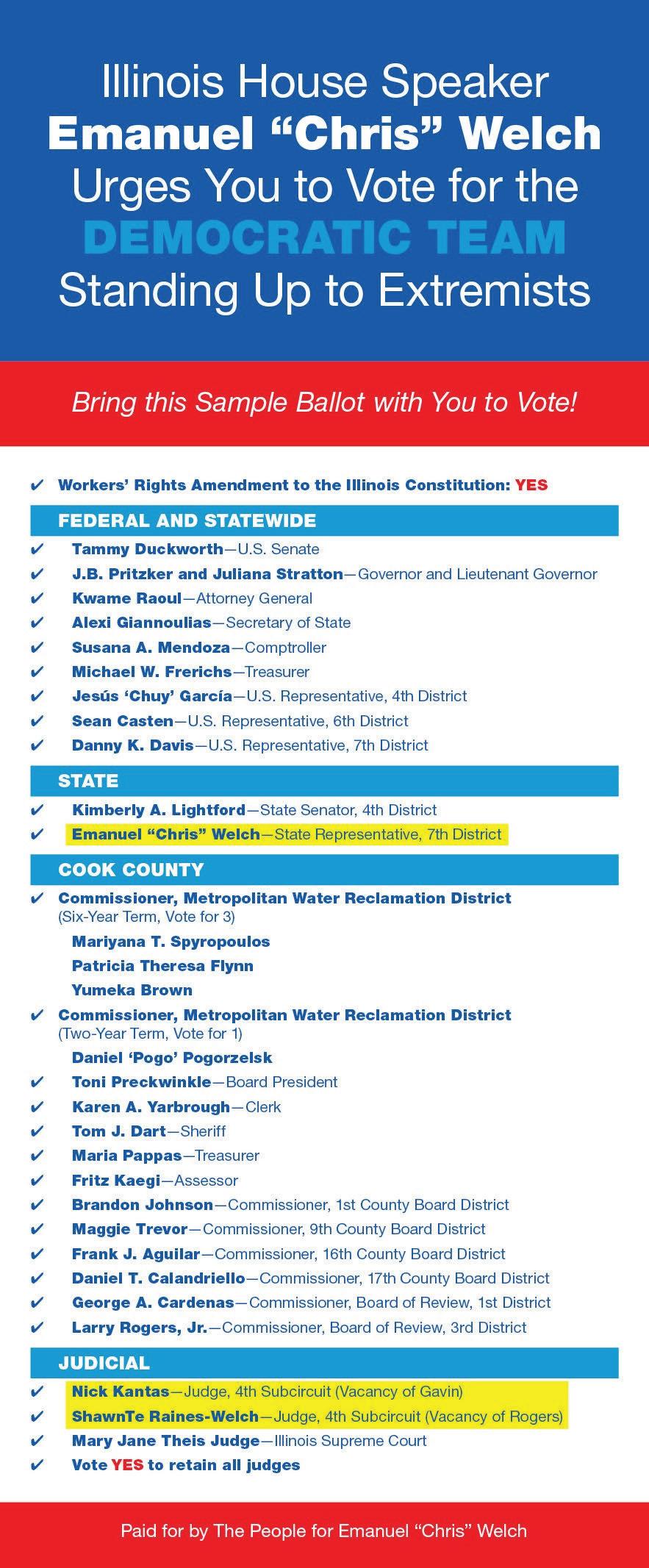 2 Villag Fr Pr November 2, 2022 Paid for by The People for Emanuel “Chris” Welch Illinois House Speaker Emanuel “Chris” Welch Urges You to Vote for the DEMOCRATIC TEAM Standing Up to Extremists Bring this Sample Ballot with You to Vote! VOTE on November 8th!