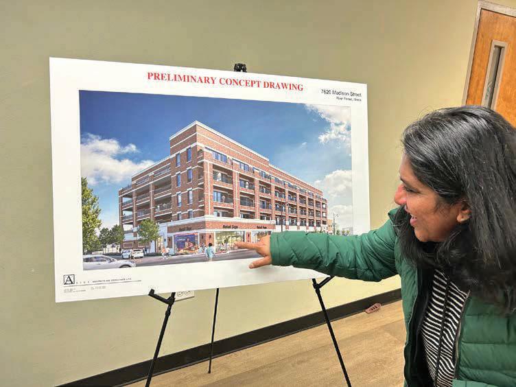 River Forest resident Sheba Chiplunkar points out a feature on a render ing of the proposed development of a v illage-owned parcel at 7620 W. Madison St.