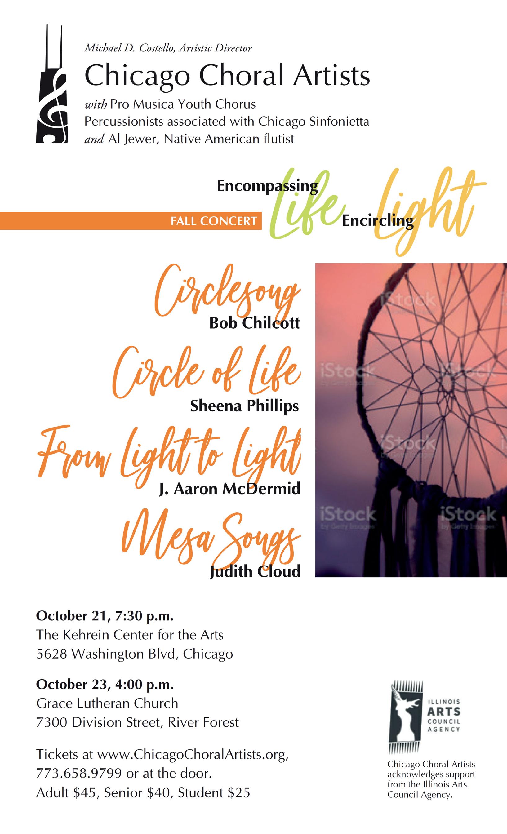 Sunday, Oct. 23, 4 p.m., Grace Lutheran Church Chicago Choral Ar tists, under the direc tion of Michael D. Costello, presents music celebrating our connection to nature and the ear th. Joining Chicago Choral Ar tists for these concerts will be Pro Musica Youth Chorus, autist Al Jewer, and percussionists associated with Chicago Sinfonietta. The program will feature Bob Chilcott's "Circlesong," based on 12 poems from indigenous Nor th American traditions. Additional works include Sheena Phillips'"Circle Of Life," Judith Cloud's "Mesa Songs," and J. Aaron McDermid's "From Light To Light," based on original texts by Susan Palo Cherwien. Tickets available in advance, through Chicago Choral Ar tists, or at the door: Adult $45, Senior $40, Student $25. 7300 W. Division, River Forest.