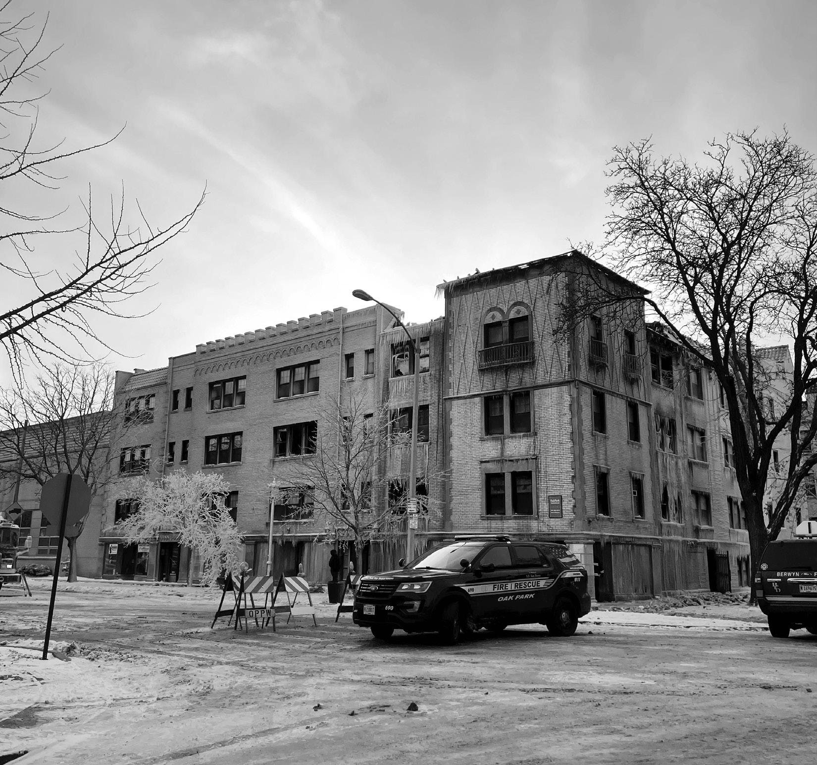 Oak Park firefighters ar rived onsite at 12:23 a.m., Dec 23 to find smoke visible from a vacant first-floor storefront. The flames spread through the walls up to the building’s second- and third-floor residences and moved to sur rounding units, according to a news release from the vil-