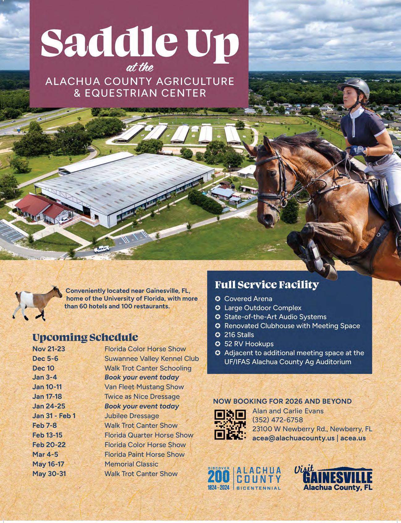 Alachua County Agricultural Center 23100 W Newberry Road, Newberry FL 352-472-6758 acea@alachuacounty.us, southeasthorseshows.com