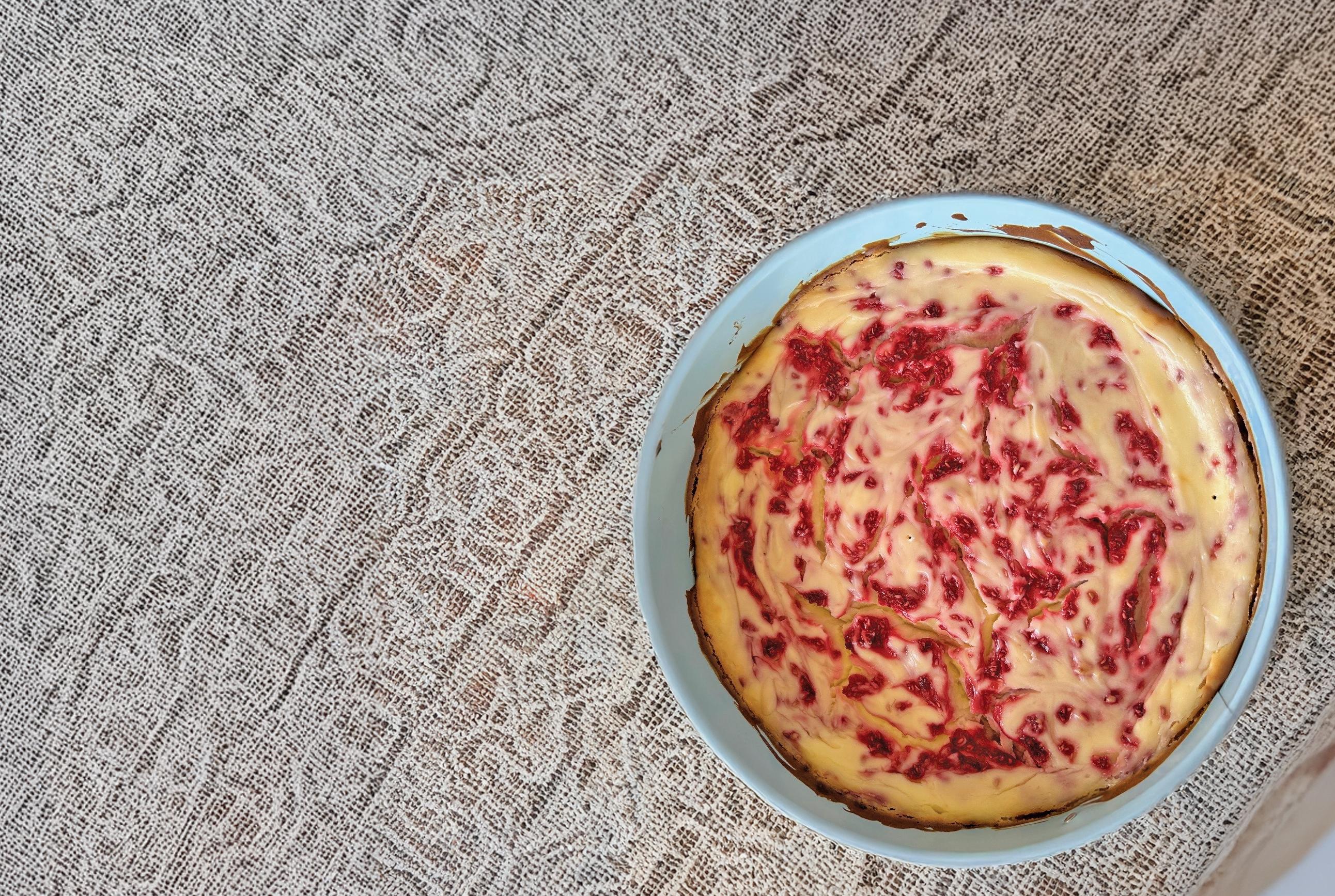 – Pour mixture into prepared crumb and spread evenly, adding the leftover raspberries on top.