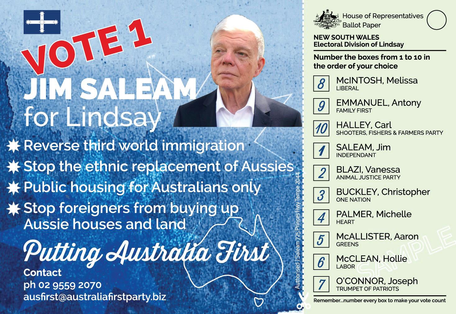 Australia First candidate Jim Saleam, who has run in Lindsay before, said he is running in Lindsay to raise public awareness on issues he sees in St Marys and Bradfield.