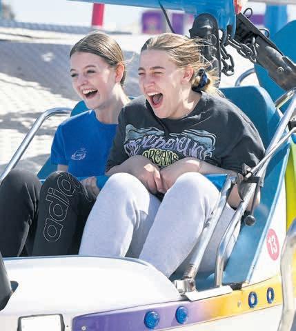 GOOD TIMES: Left, Gabrielle Purchase and Melody Chilton enjoy the Matterhorn ride. Right, Mitchell and Lucinda Smith with their champion white suffolk at the Horsham Show on Sunday.