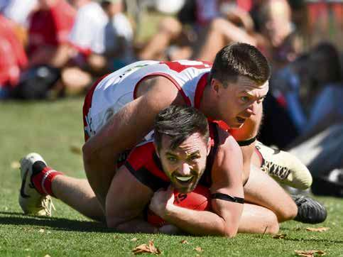 FIERCE: Ararat’s Tom Mills tackles Tom Sullivan, Stawell, during the Warriors win on Friday.