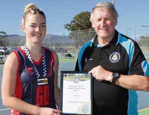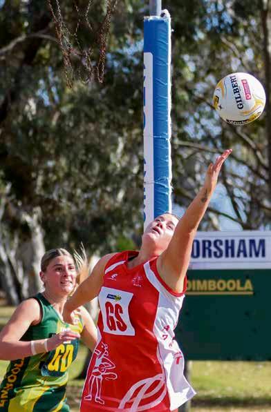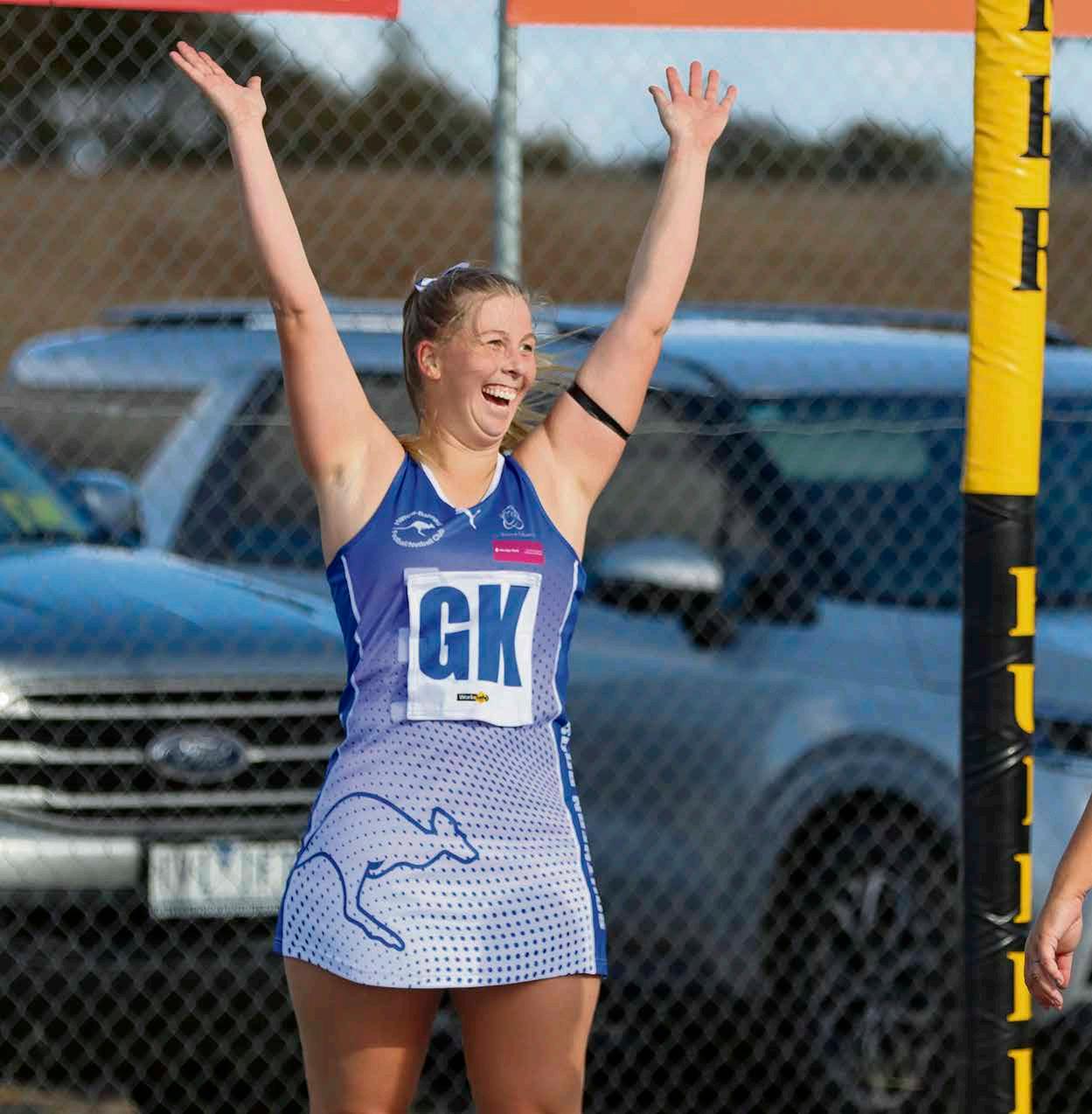 Harrow Balmoral’s A Grade netball coach Emily Langley celebrates the Southern Roos’ drought-breaking fourgoal victory over a gutsy Pimpinio in Horsham District league action on Saturday. The Roos were winless in 2023. Kaniva-Leeor footballers also celebrated their first win of the season with former AFL player Harley Bennell starring in the 10-point win over Taylors Lake. Story, page 52.