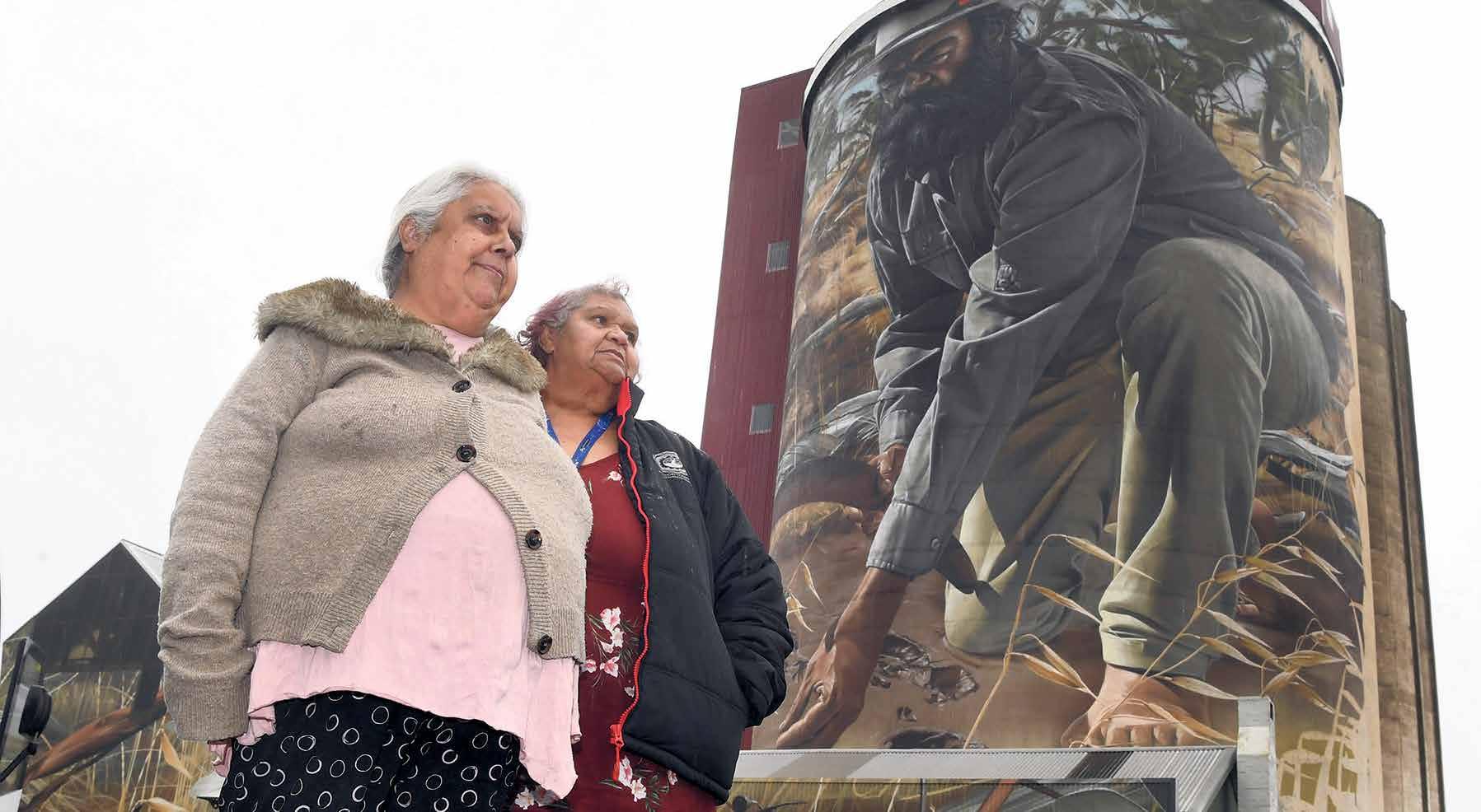 PRIDE: Noelene Douglas and Alva Taylor were among a group of Indigenous Elders and respected persons to tour the region’s Silo Art Trail, including Horsham featuring the story of Wotjobaluk warrior Yanggendyinanyuk, as part of NAIDOC Week activities yesterday. A range of events and activities across the region this week, designed to the theme of ‘For our Elders’ will acknowledge the important influence, contributions and legacy of Aboriginal and Torres Strait Islander Elders. More pictures, page 23.