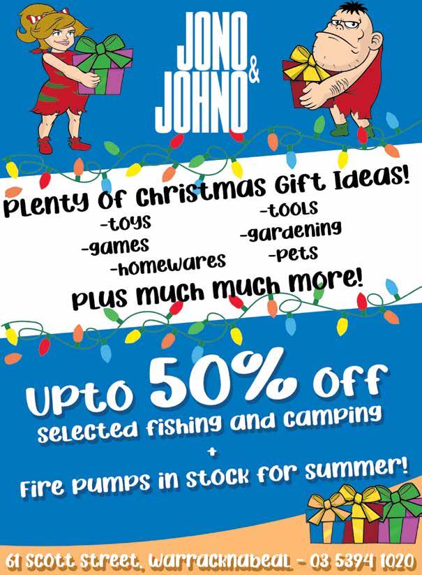Page 11 The BIG Christmas Catalogue 2022 www.theweeklyadvertiser.com.au The Weekly Advertiser, 3WM and MIXX FM wish everyone a fantastic Christmas and hope they have a wonderful time shopping locally! Dance like Santa’s watching! BIG Catalogue CHRISTMAS CATALOGUE BIG advertising feature www.lardnerbros.com.au Ph 5352 1074 2 Ingor Street, Ararat, 3377, Victoria Electric Bikes In Stock 10% o RRP Globe Mini Skateboards - 50% o Electric Scooters Dual Suspension Bikes In Stock 20% o RRP – Limited Stock Mongoose BMX Bike Limited Edition California $489 Boxed, Built extra $80 – Normally $699 Mongoose BMX Bike Super Goose $599 Boxed, Built extra $80 – Normally $799 All Adult Bikes Sold receive a free helmet, lube and bike lock valued at $150! EPrime Air $750 - Normally $899 EGlide G60 $620 - Normally $799 Standard Skateboard - 20% o locksmiths & security All Specials from now until Xmas, while stock lasts!
