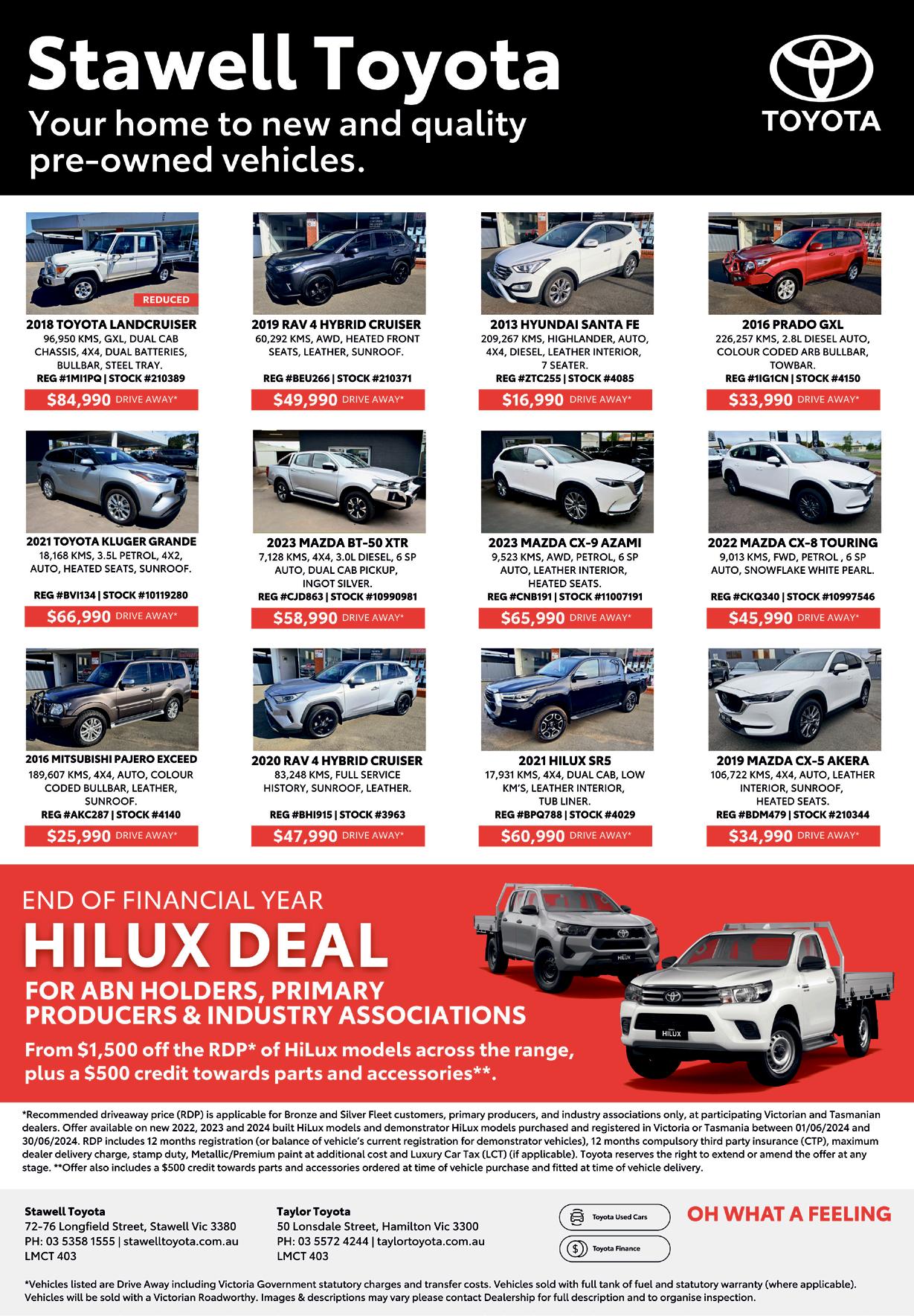 KMART • BEST AND LESS • SPOTLIGHT • REJECT SHOP • WIDE RANGE OF SPECIALTY STORES • WWW.HORSHAMPLAZA.COM.AU At participating restaurants for a limited time only. ®/© 2024 Subway IP LLC. IN THIS ISSUE • Speeding offences on police radar • King’s Birthday honours • Championship medals AUDITED: 21,534 COPIES October 2022 to September 2023 Source: AMAA; CAB Total Distribution Audit for further information visit www.auditedmedia.org.au Phone: 03 5382 1351 Read it online: www.theweeklyadvertiser.com.au