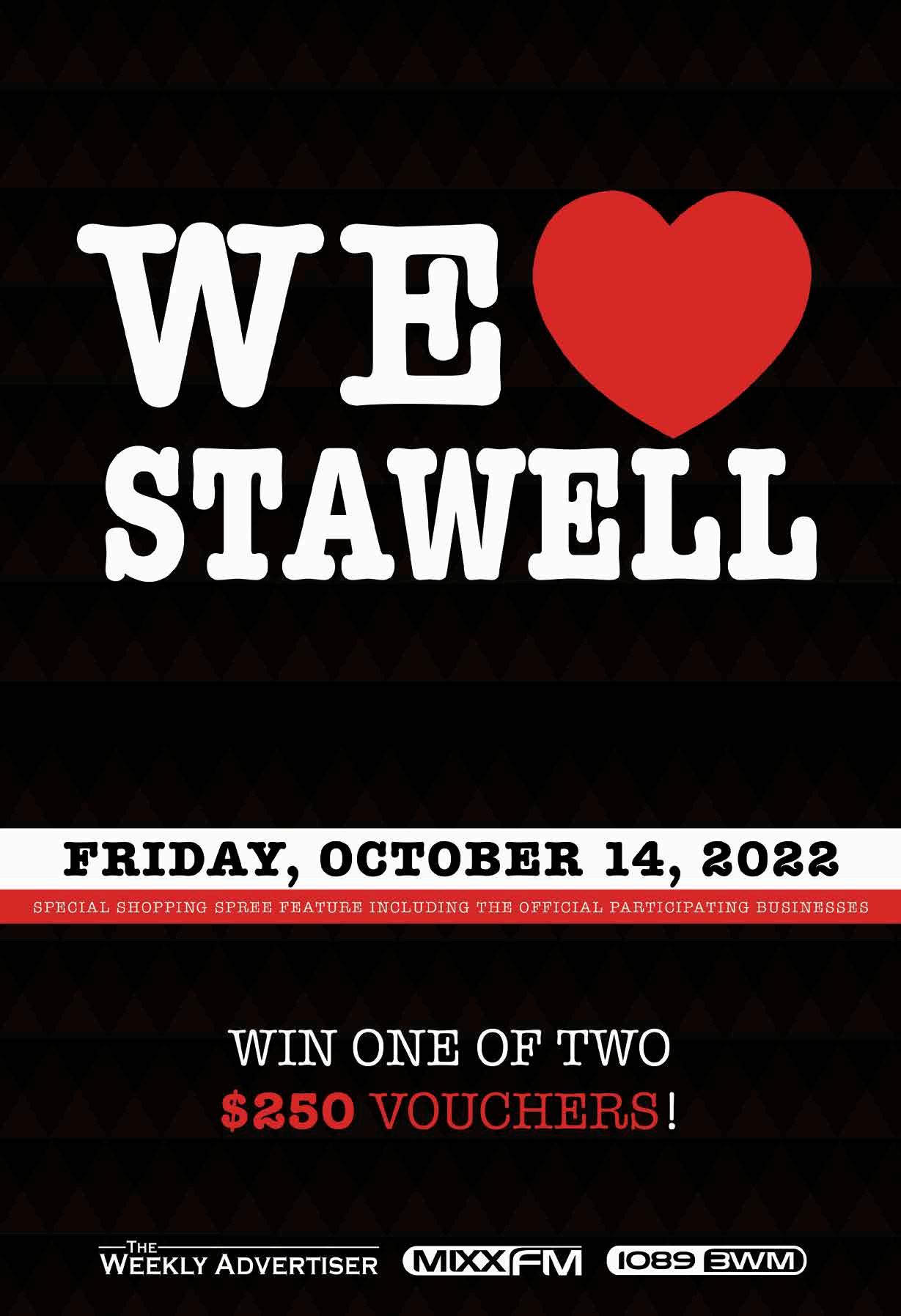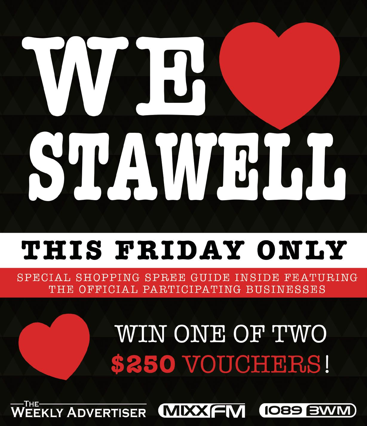 Doyou? Let’s make a difference by giving Stawell the love it deserves... MIXX FM, 3WM and The Weekly Advertiser are excited to announce a one-day shopping spree on Friday, October 14. Support local businesses, have a great day out and grab yourself a bargain! Shopping Spree Friday, October 14 Buy a product at any participating We Love Stawell business on October 14 and your receipt to the MIXX FM Outside Broadcast Van at 108 Main Street to go into the draw to win! WIN Two lucky customers will win $250 vouchers to be used at any participating business! Special We Love Stawell feature inside this edition. READ